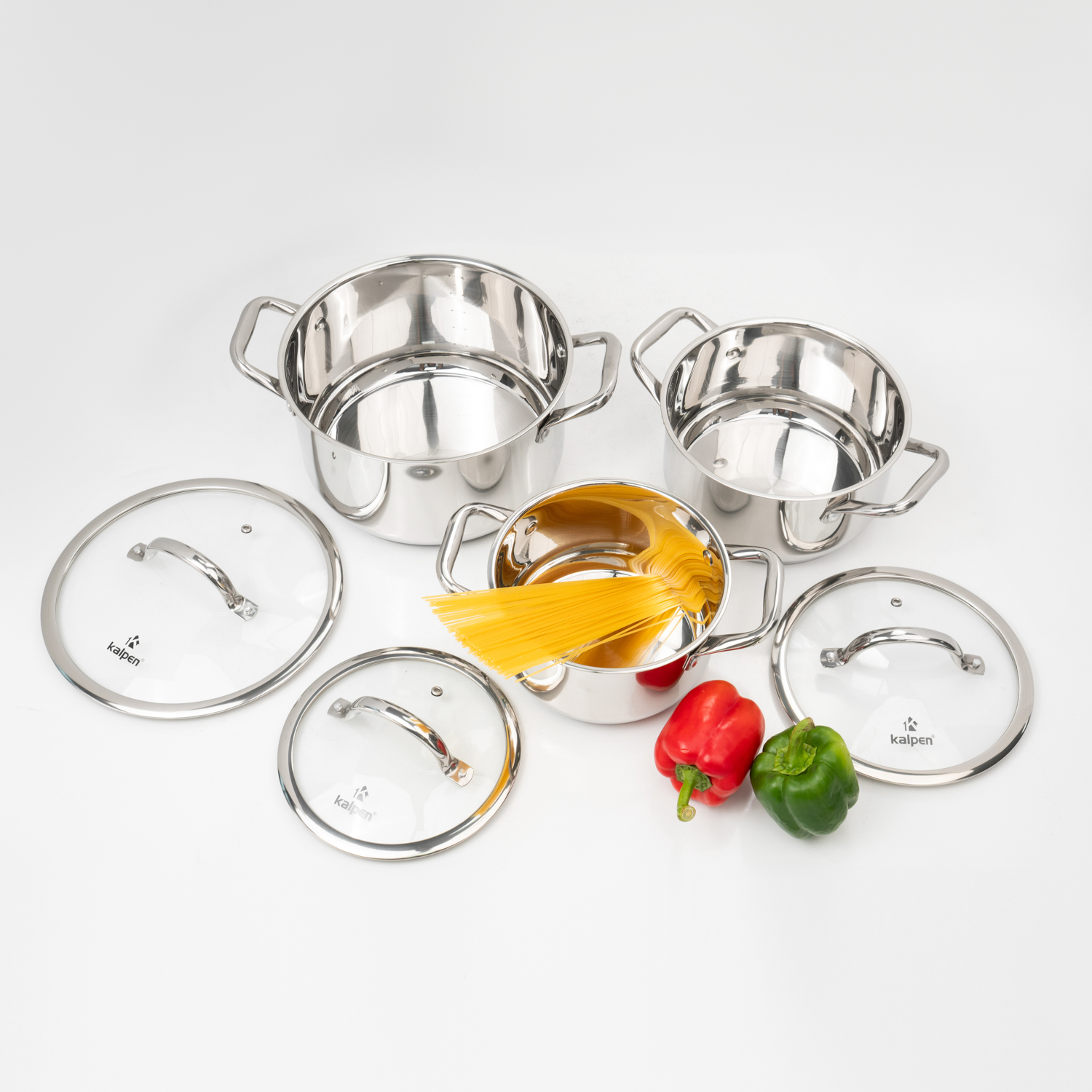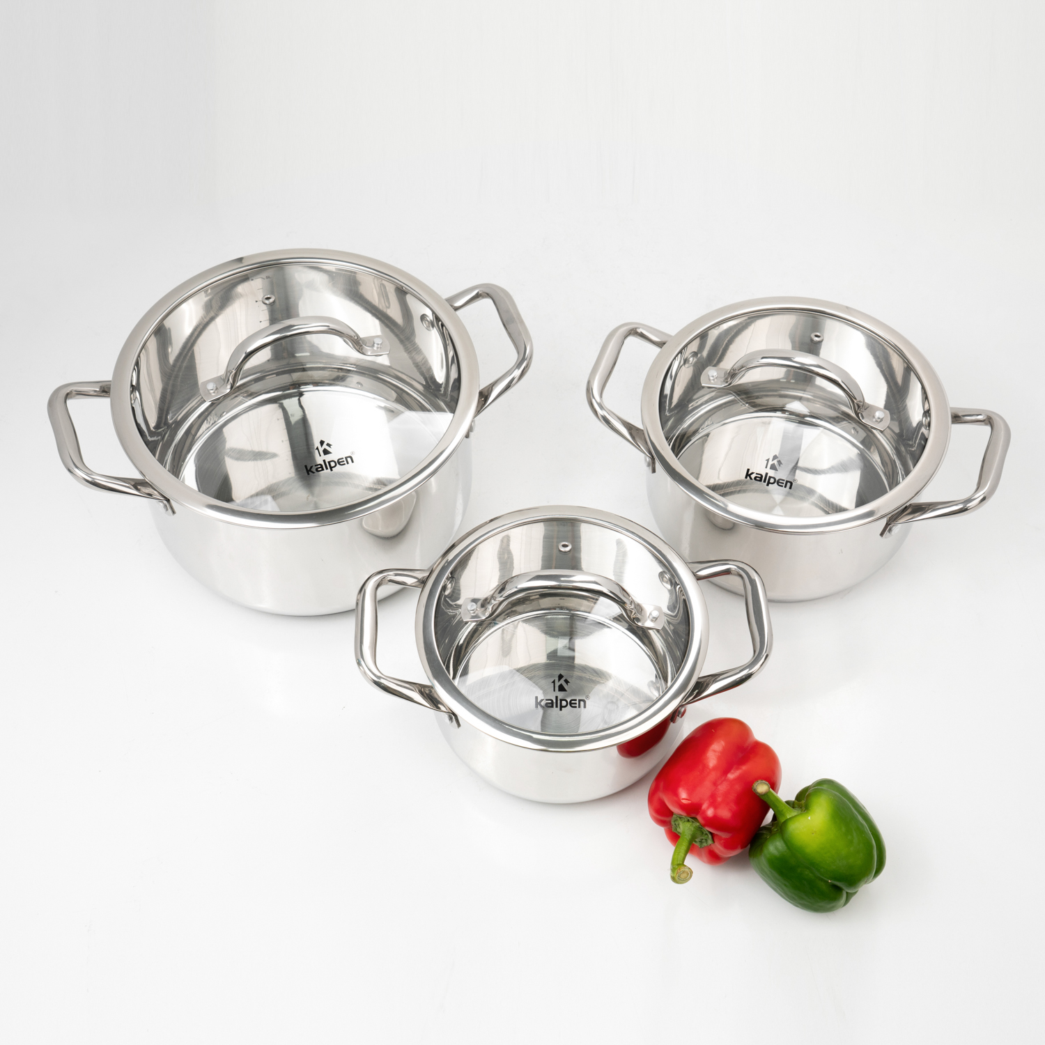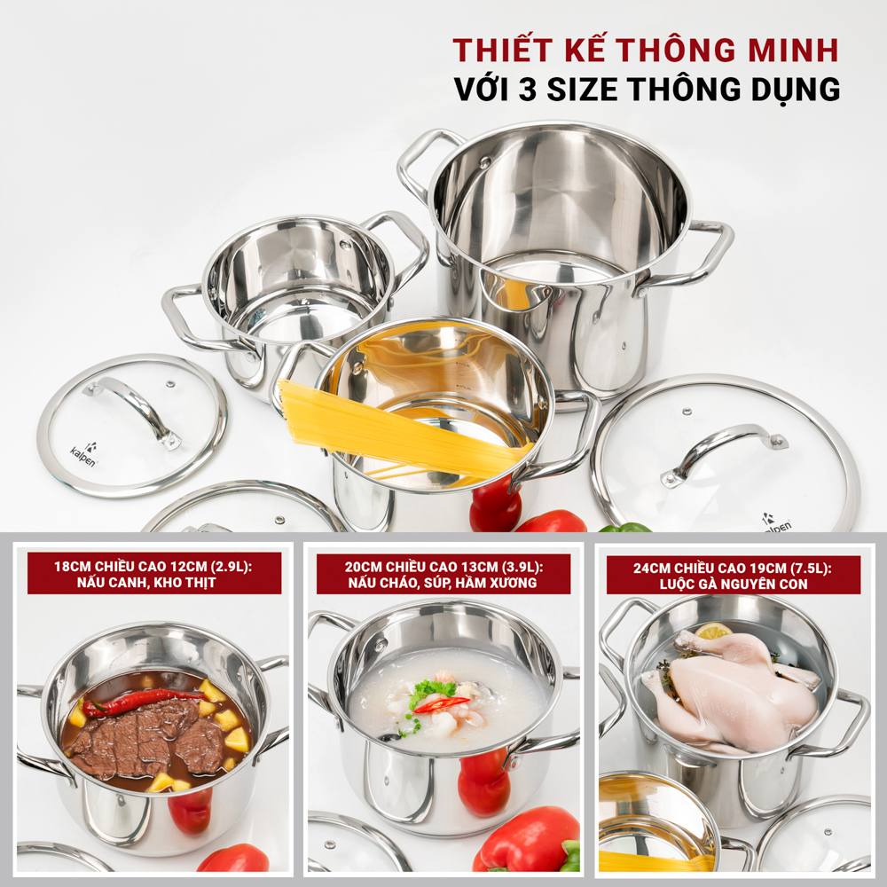 Bộ nồi Kalpen Glanzer GL1 bao gồm 3 nồi với các kích thước khác nhau, phù hợp với nhiều nhu cầu sử dụng.