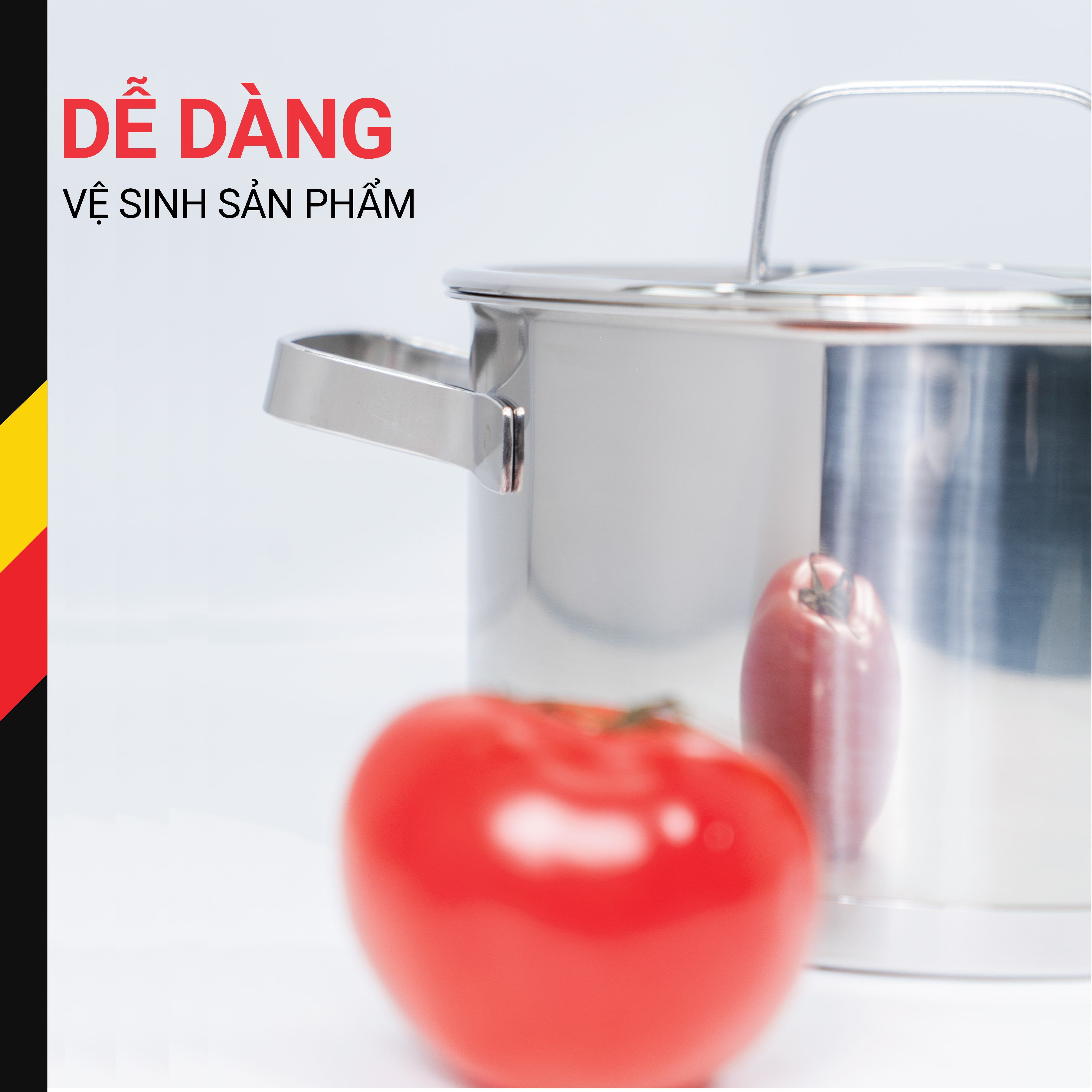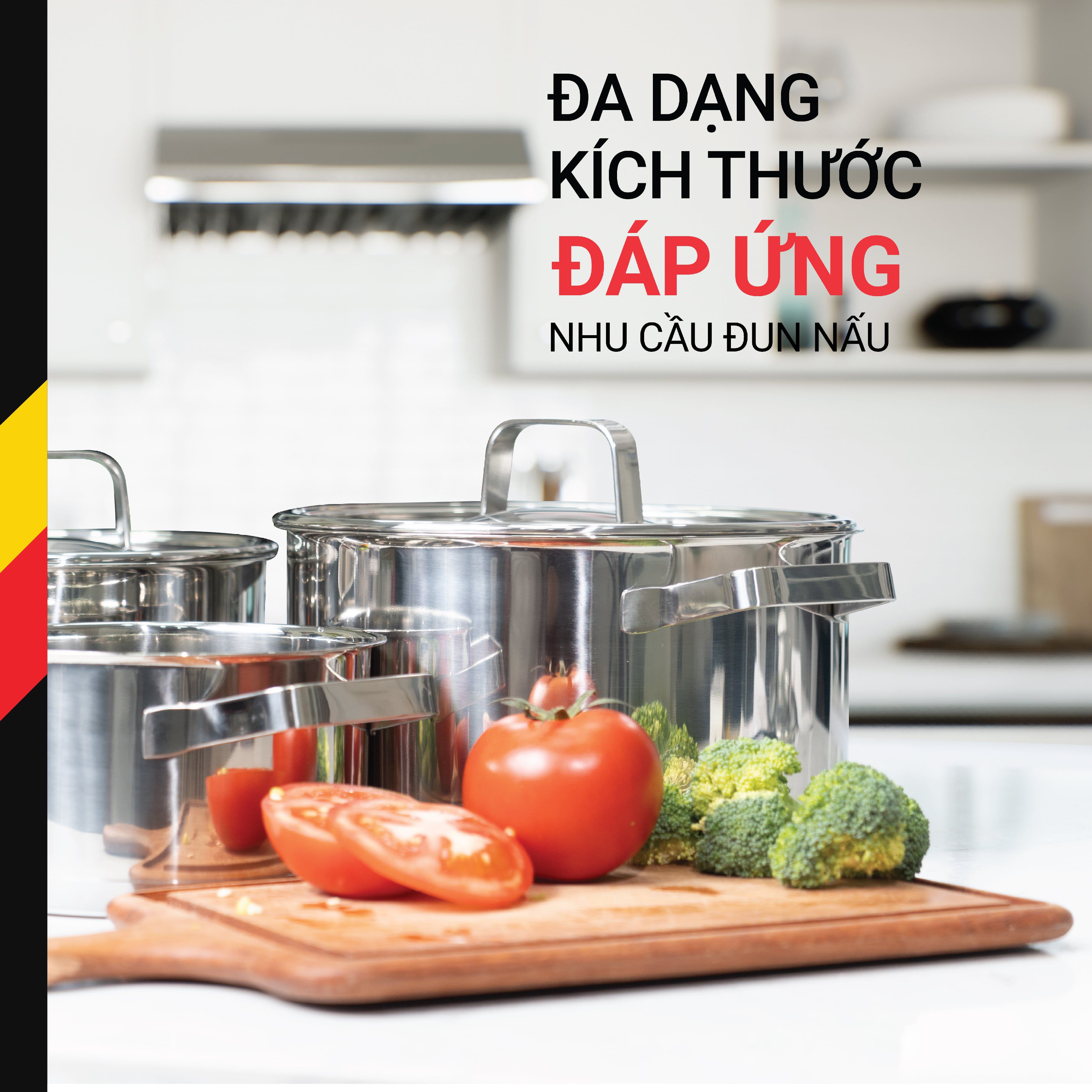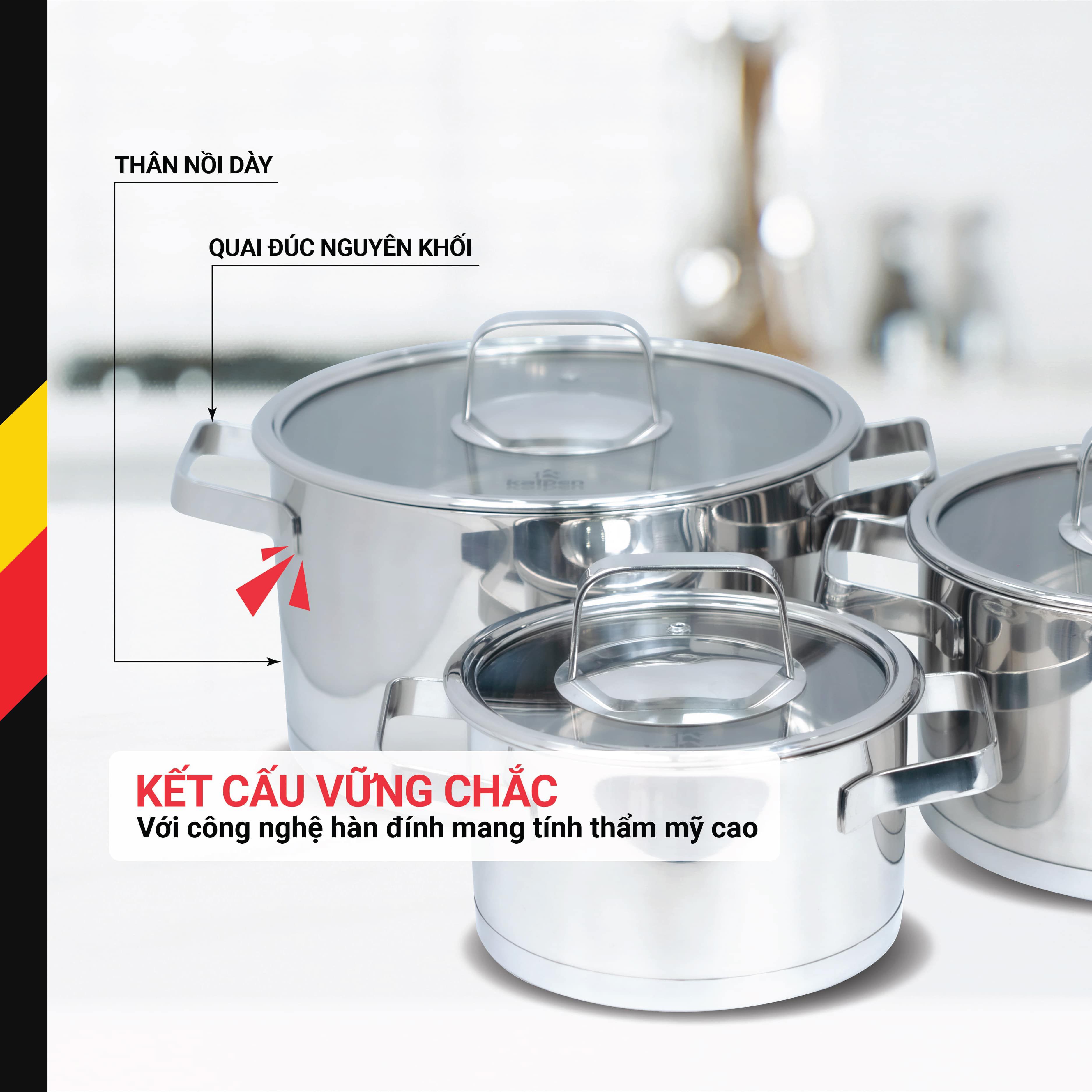 Bộ sản phẩm 3 nồi với 3 kích thước khác nhau đáp ứng được nhu cầu nấu nướng cơ bản trong một gia đình lại có tính đồng bộ về kiểu dáng, màu sắc, chất lượng góp phần tạo nên tính thẩm mỹ cho căn bếp hiện đại.