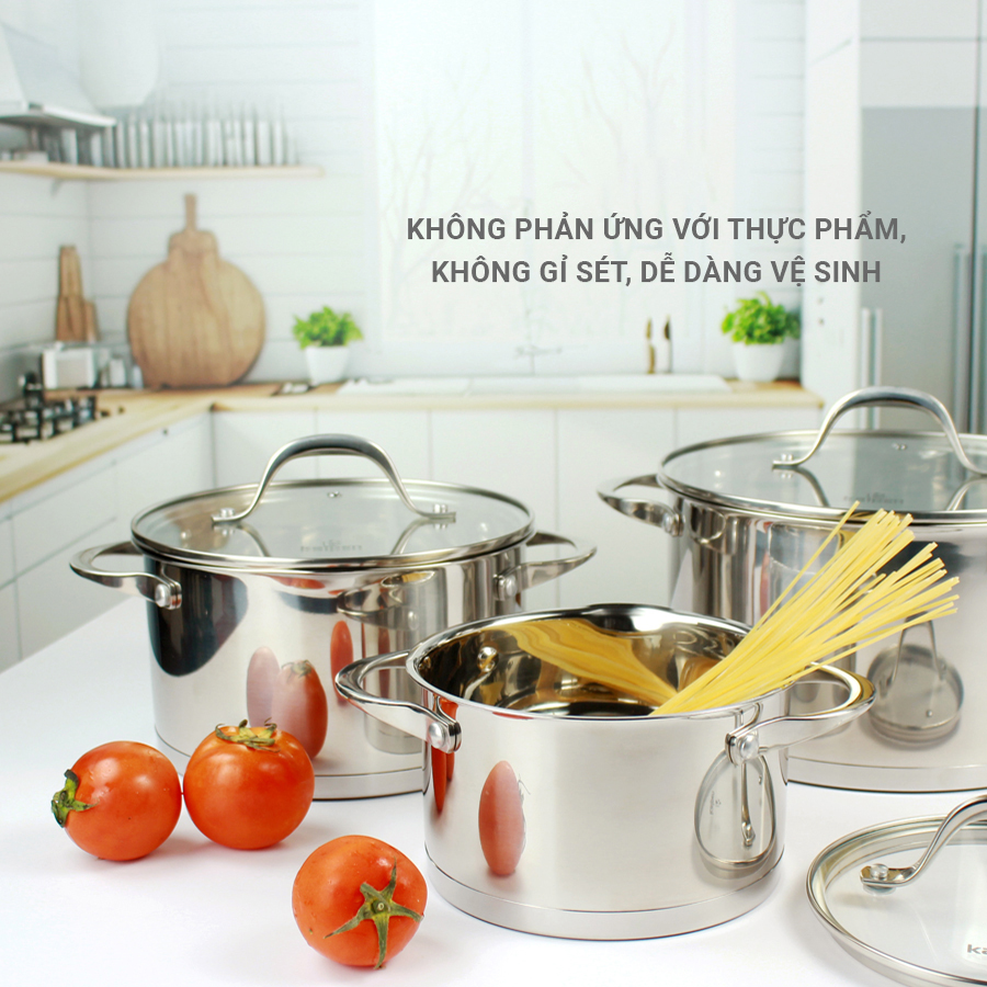 Bộ 3 nồi với 3 size 16-20-24cm phù hợp cho nhiều nhu cầu nấu nướng của gia đình như chế biến món kho, món canh, luộc gà...