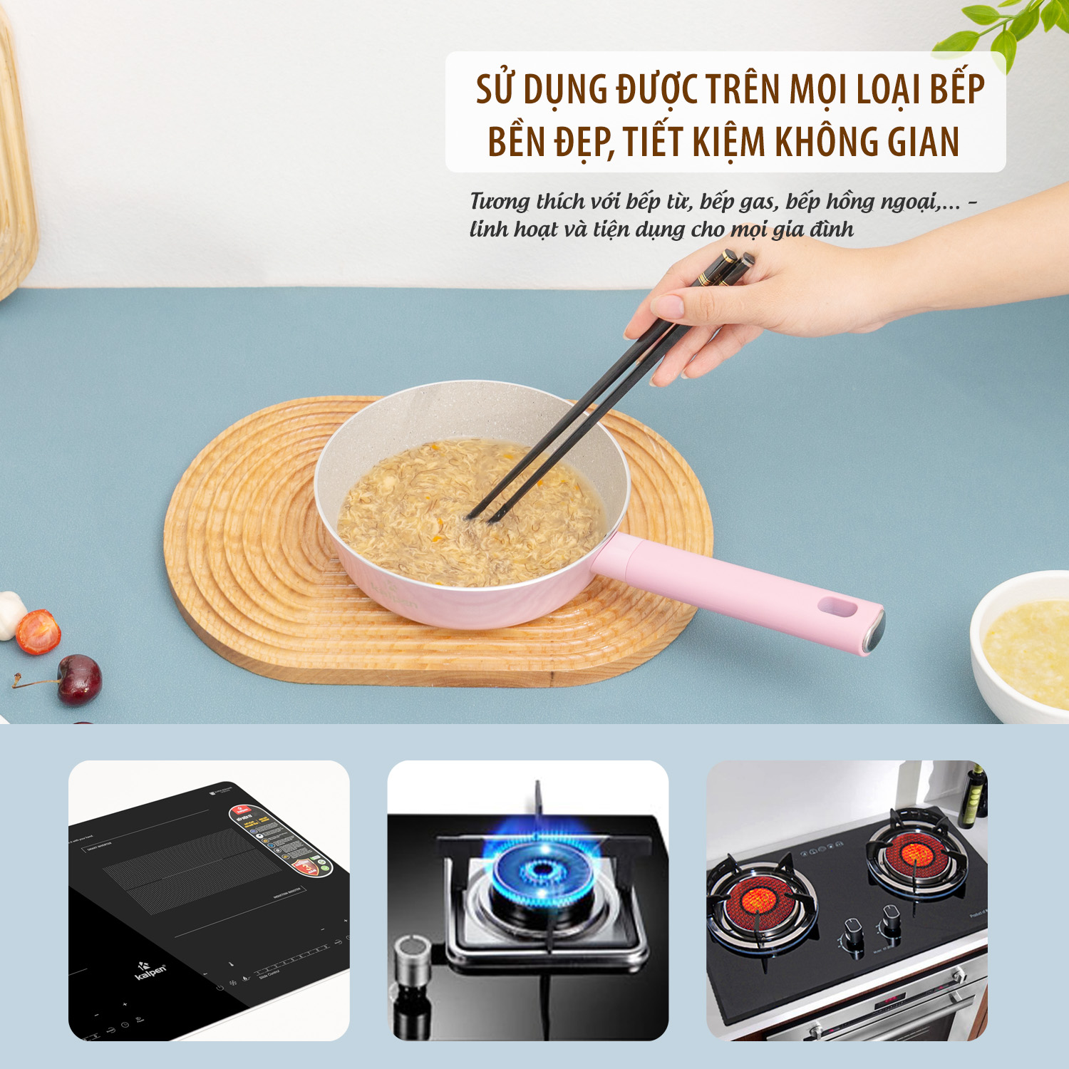 Chảo Kalpen Baby tương thích với tất cả các thiết bị bếp: bếp ga, bếp từ, bếp điện, bếp hồng ngoại… vì thế phù hợp sử dụng ở tất cả các gia đình.