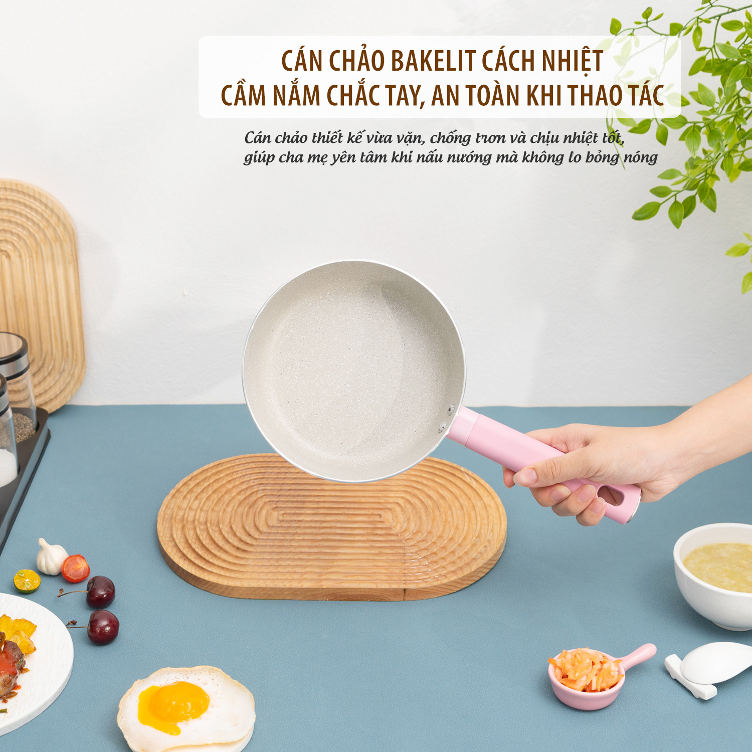 Cán chảo được làm bằng nhựa bakelit cách nhiệt, chống nóng, màu sắc đồng bộ với thân chảo tạo nên sự hài hòa và nổi bật trong nhà bếp.