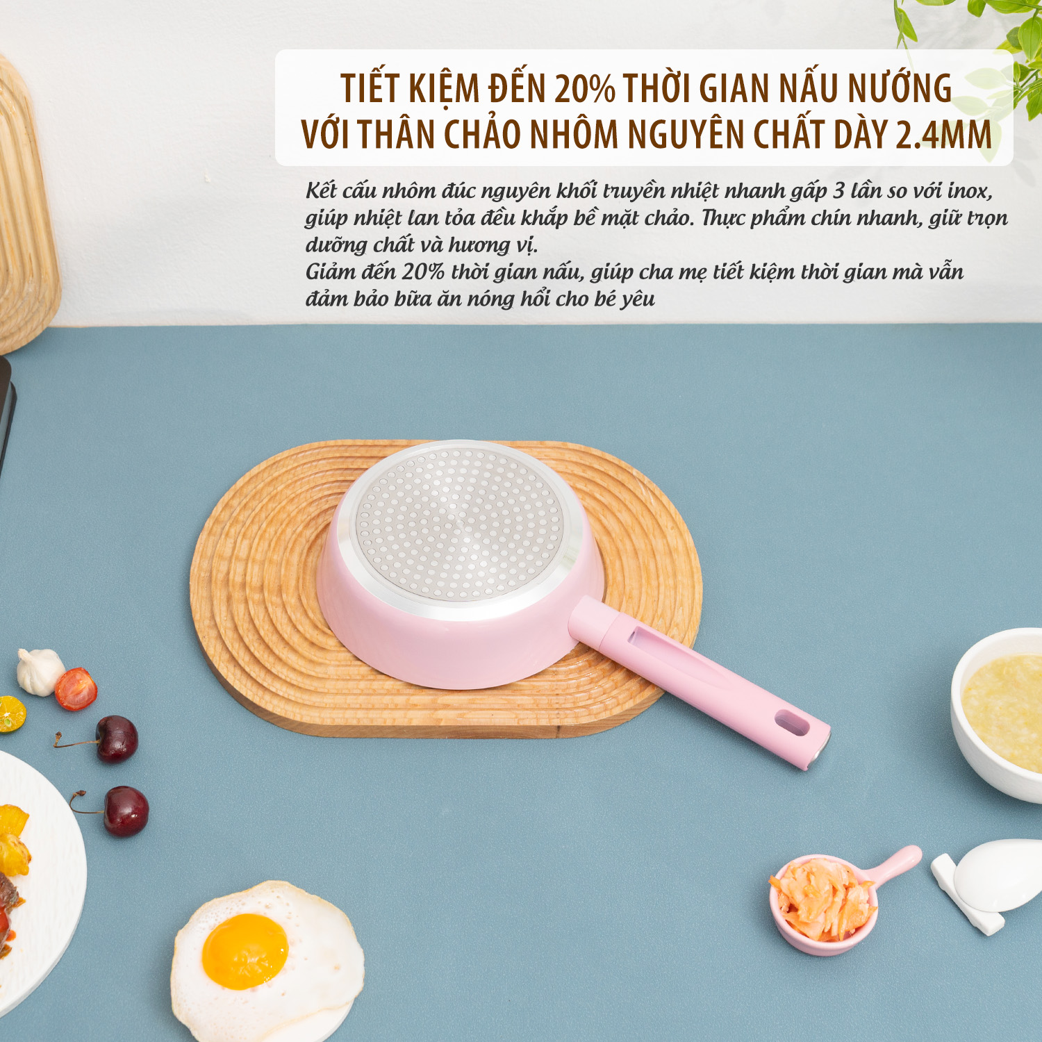 Chảo Kalpen Baby được làm từ nhôm nguyên chất và có độ dày 2.4mm nên không chỉ có khả năng bắt nhiệt nhanh mà còn giữ nhiệt lâu, tỏa nhiệt đều vì thế mà rút ngắn được thời gian nấu nướng, chị em nội trợ có thêm nhiều thời gian để chăm sóc bản thân.