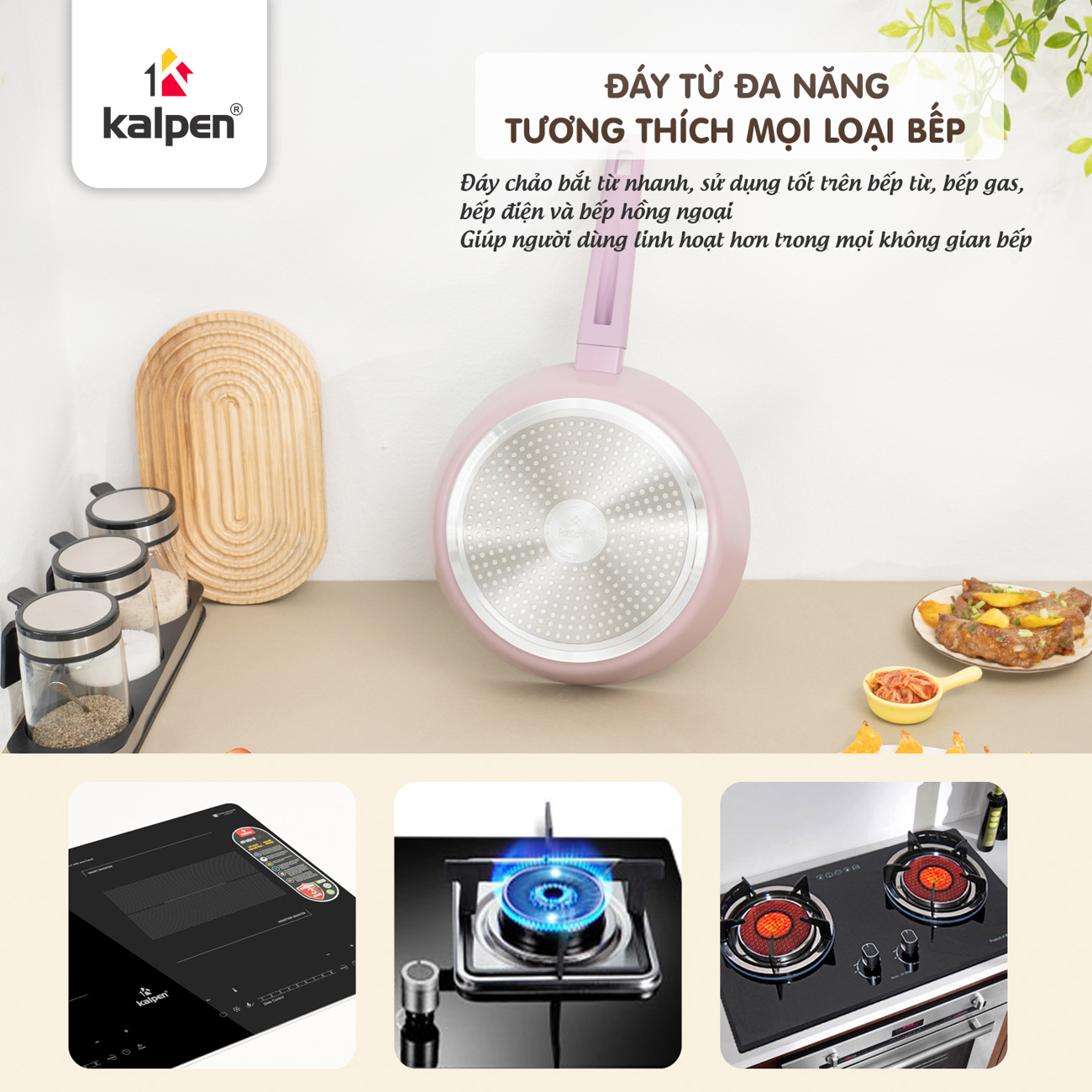 Thiết kế đáy từ giúp chảo sử dụng hiệu quả trên bếp từ, bếp ga, bếp điện và bếp gốm, đáp ứng linh hoạt nhu cầu nấu nướng trong mọi gian bếp.