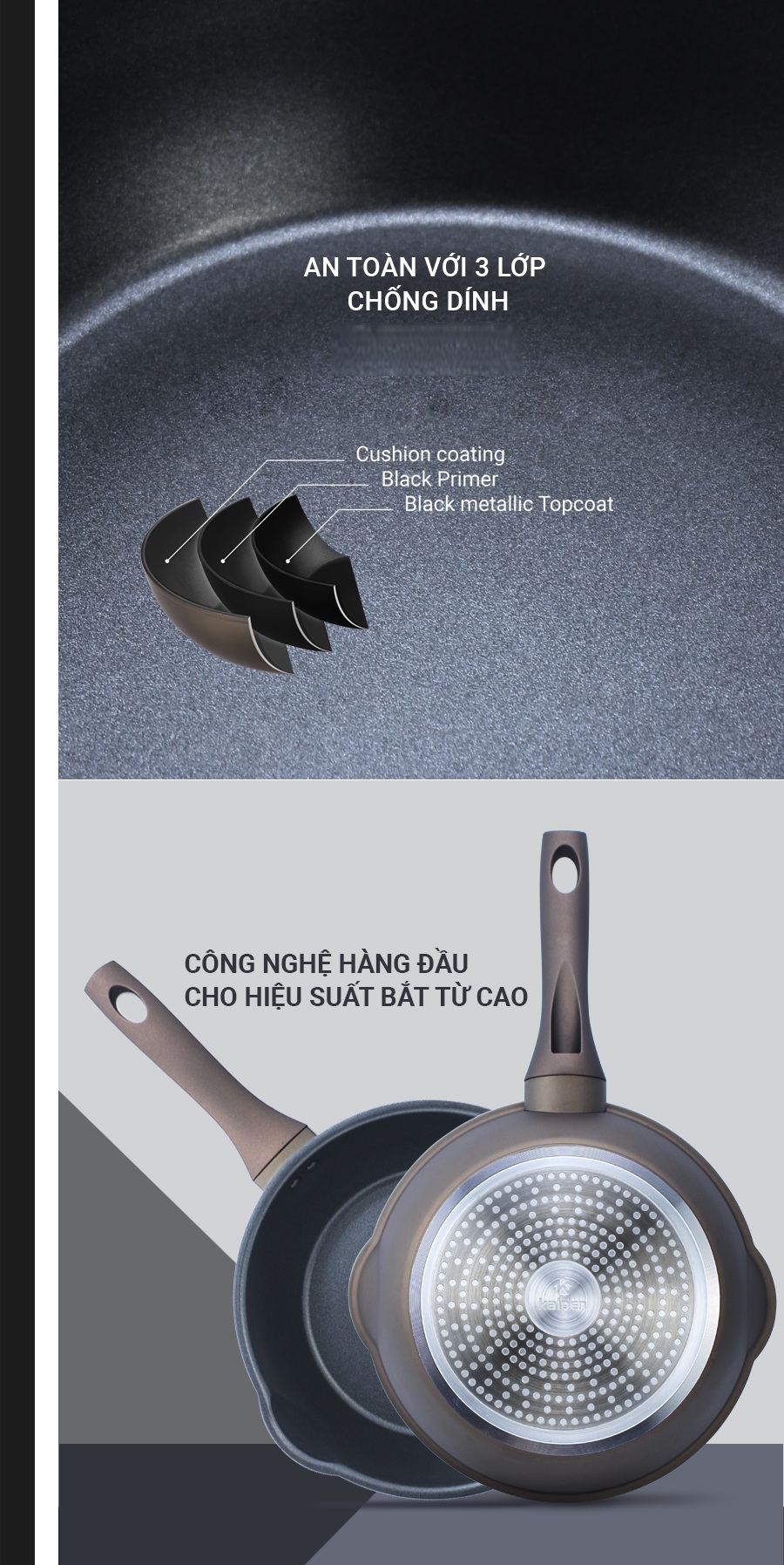Lớp chống dính an toàn: Sử dụng chống dính 3 lớp cao cấp an toàn và không giải phóng chất PFOA gây ung thư, siêu bền với độ dày 50µm có khả năng trà sát lên đến 80.000 lần.