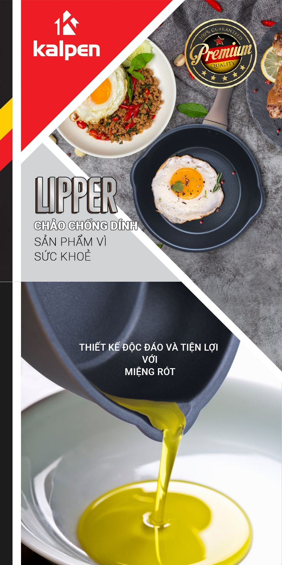 Chảo chống dính cao cấp Kalpen Lipper là một sản phẩm được thiết kế hoàn toàn mới mà thương hiệu Kalpen muốn giới thiệu đến các chị em nội trợ. Với việc thoát khỏi các thiết kế của các dòng chảo thông thường, chảo chống dính cao cấp Kalpen Lipper được tích hợp thêm hai miệng rót đối xứng ở hai bên giúp việc nấu ăn trở nên vô cùng tiện lợi. Màu sắc chủ yếu của sản phẩm là màu xám thể hiện sự sang trọng, một thiết kế vô cùng phù hợp cho mọi căn bếp nhà bạn.