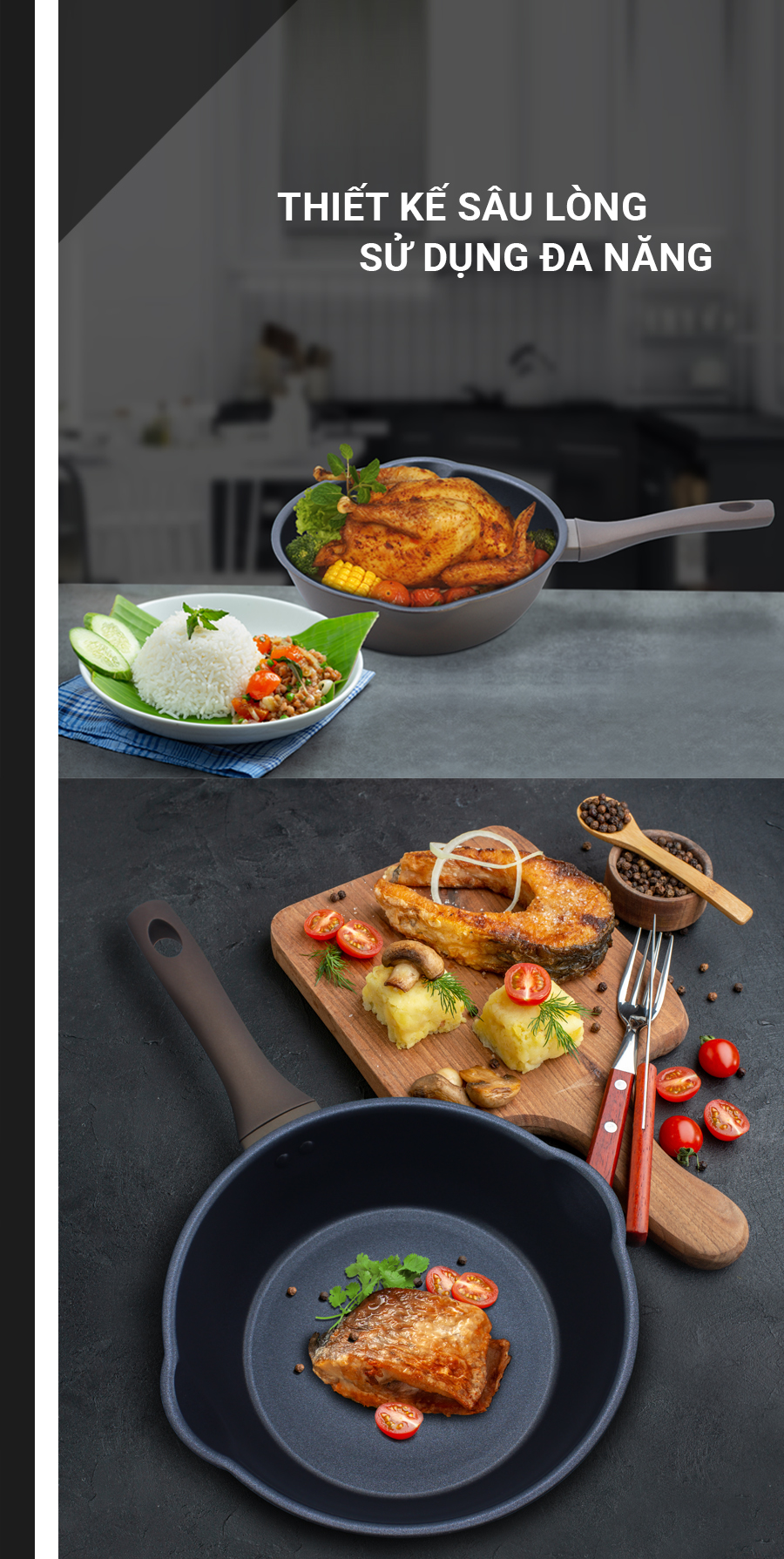 Thiết kế tiện lợi: Cán chảo bakelit cách điệu, chịu nhiệt lên đến 180 độ C