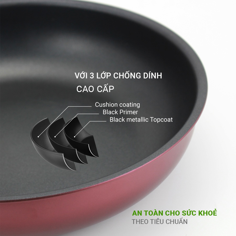 Chảo chống dính Kalpen Pupler được phủ 3 lớp chống dính cao cấp, không chứa chất PFOA, APEO, độ chống dính cao, có khả năng chống chịu tốt với môi trường axit, kiềm, dầu, dung môi hữu cơ nên an toàn cho sức khỏe người sử dụng.