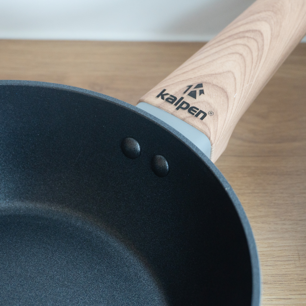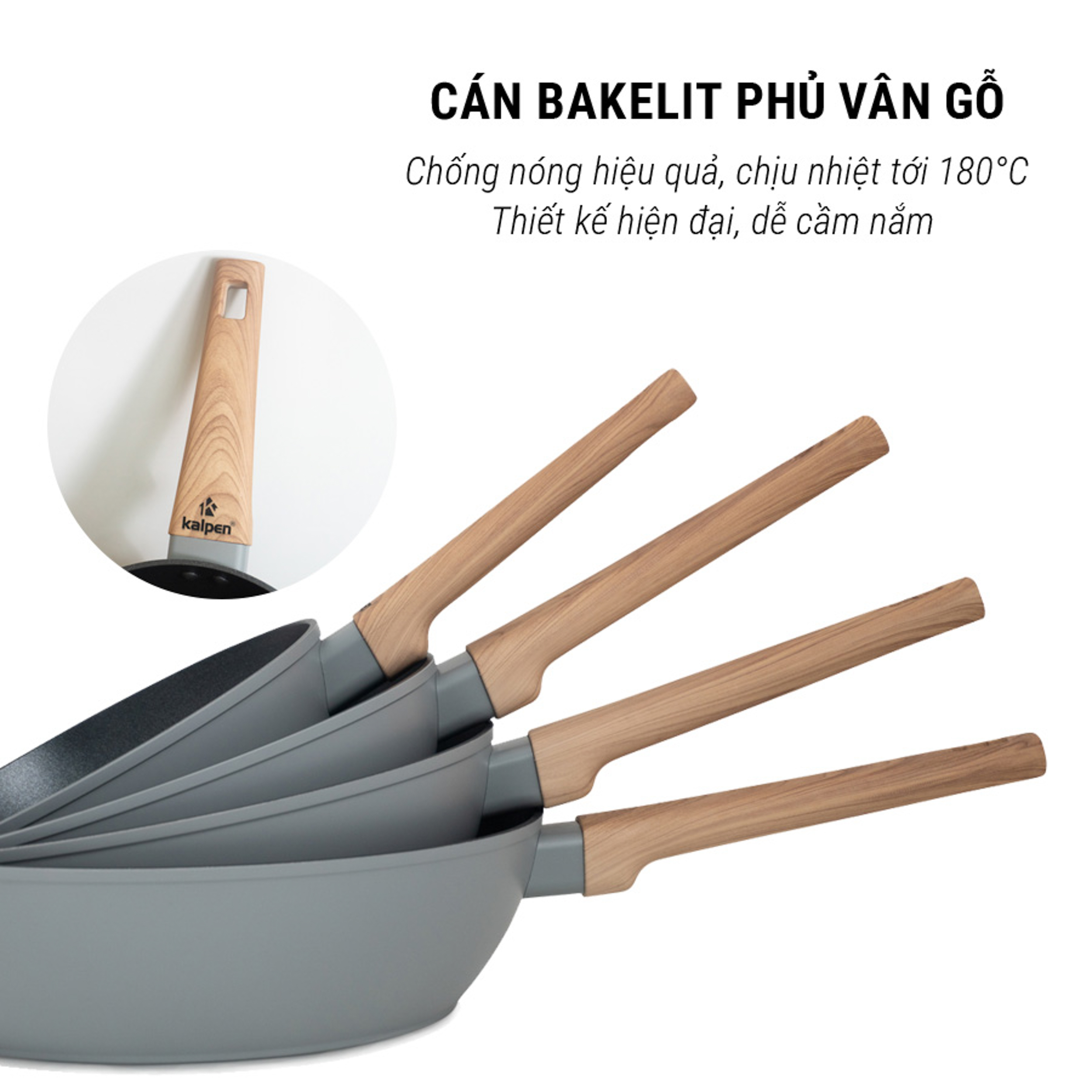 Không chỉ đầu tư kỹ lưỡng vào lòng chảo, Kalpen Suder còn chăm chút từng chi tiết nhỏ như cán cầm Bakelit phủ vân gỗ. Đây chính là điểm nhấn giúp sản phẩm thêm sang trọng và tinh tế. Với chất liệu Bakelit cao cấp, cán chảo sở hữu khả năng cách nhiệt vượt trội, chịu nhiệt lên đến 180°C, giúp bạn hoàn toàn yên tâm khi chế biến các món ăn nóng lâu trên bếp.