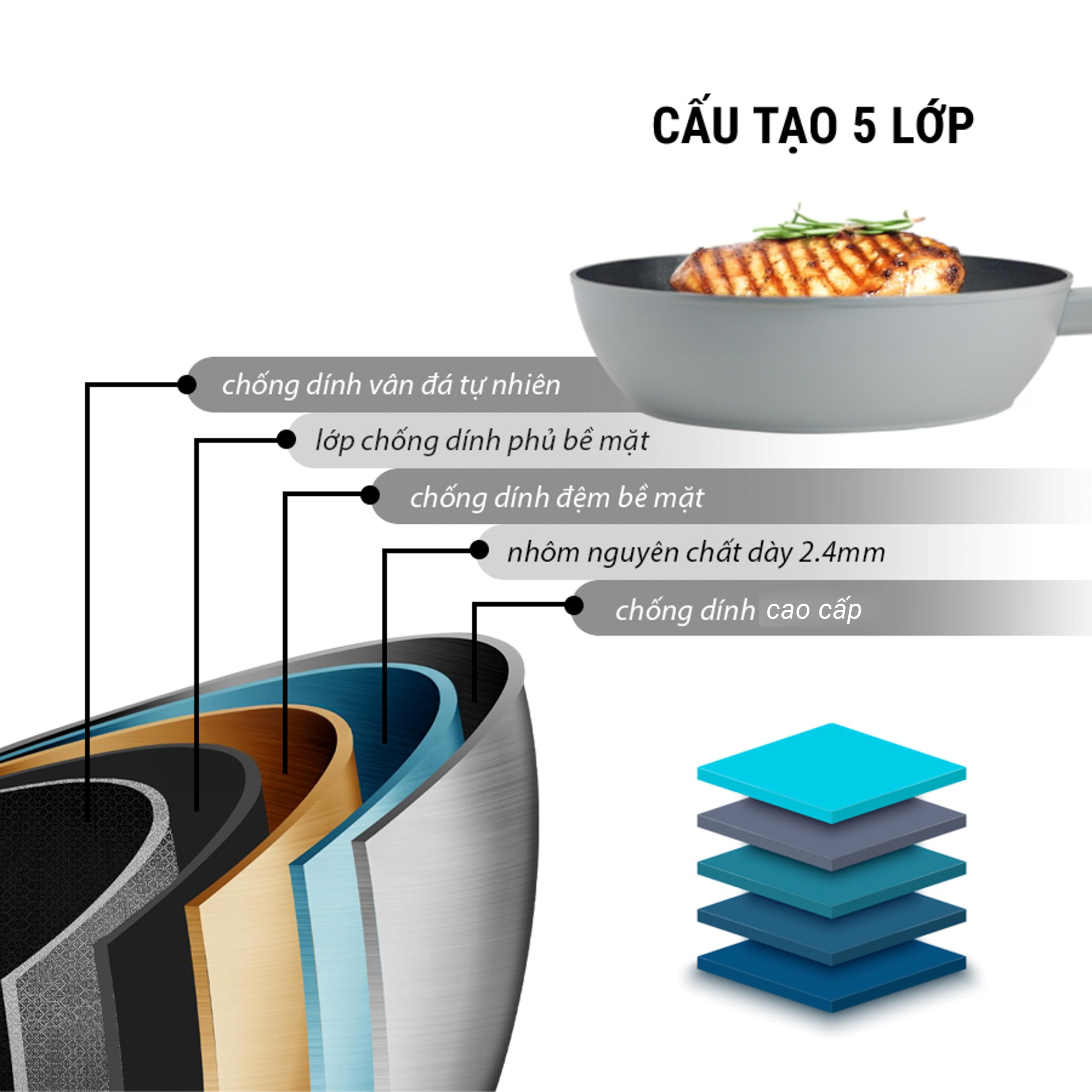 Độ dày chống dính lên đến 50µm, cho khả năng chịu mài mòn vượt trội – lên đến 80.000 lần chà xát, cao gấp nhiều lần so với các loại chảo chống dính thông thường.