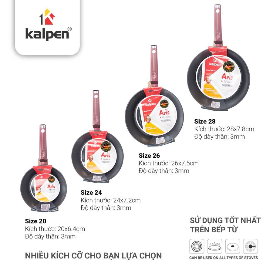 Chảo chống dính đáy từ phẳng Kalpen Aris có nhiều kích thước khác nhau, từ 20cm đến 28cm, phù hợp với nhu cầu sử dụng của từng gia đình. Chảo có độ dày và cân nặng vừa phải giúp cho chảo có độ bền cao và giữ nhiệt đều.
