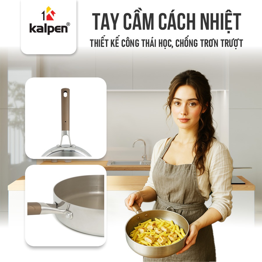 Chảo được cấu tạo từ 3 lớp liền thân gồm lớp Inox 304 bên trong, lớp hợp kim nhôm ở giữa và lớp Inox 430 dẫn từ bên ngoài. Cấu trúc này giúp chảo chắc chắn, truyền nhiệt nhanh và sử dụng ổn định trên mọi loại bếp.