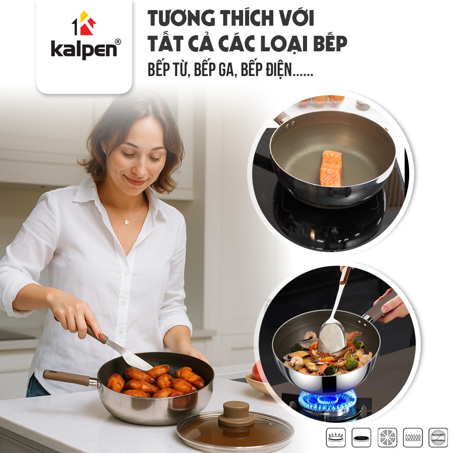 Nhờ lớp thép không gỉ dẫn từ bên ngoài, chảo sử dụng hiệu quả trên bếp từ, bếp gas, bếp điện và các loại bếp thông dụng khác, đáp ứng đa dạng nhu cầu sử dụng trong gia đình.