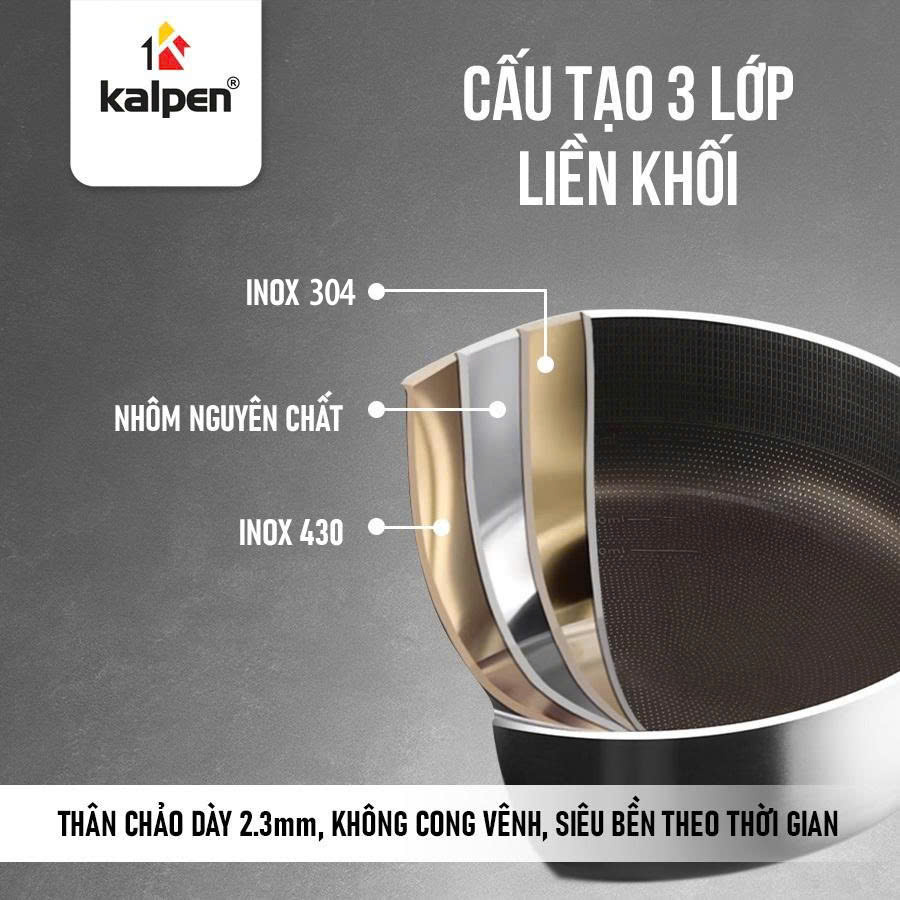 Chảo được thiết kế với cấu trúc 3 lớp liền khối gồm Inox 304 được phủ sinh học Nano Titanium, ở giữa là lớp nhôm nguyên chất giúp giữ và truyền nhiệt, lớp Inox 430 không gỉ dẫn từ bên ngoài. Cấu trúc này giúp chảo truyền nhiệt nhanh, giữ nhiệt ổn định và sử dụng hiệu quả trên mọi loại bếp.