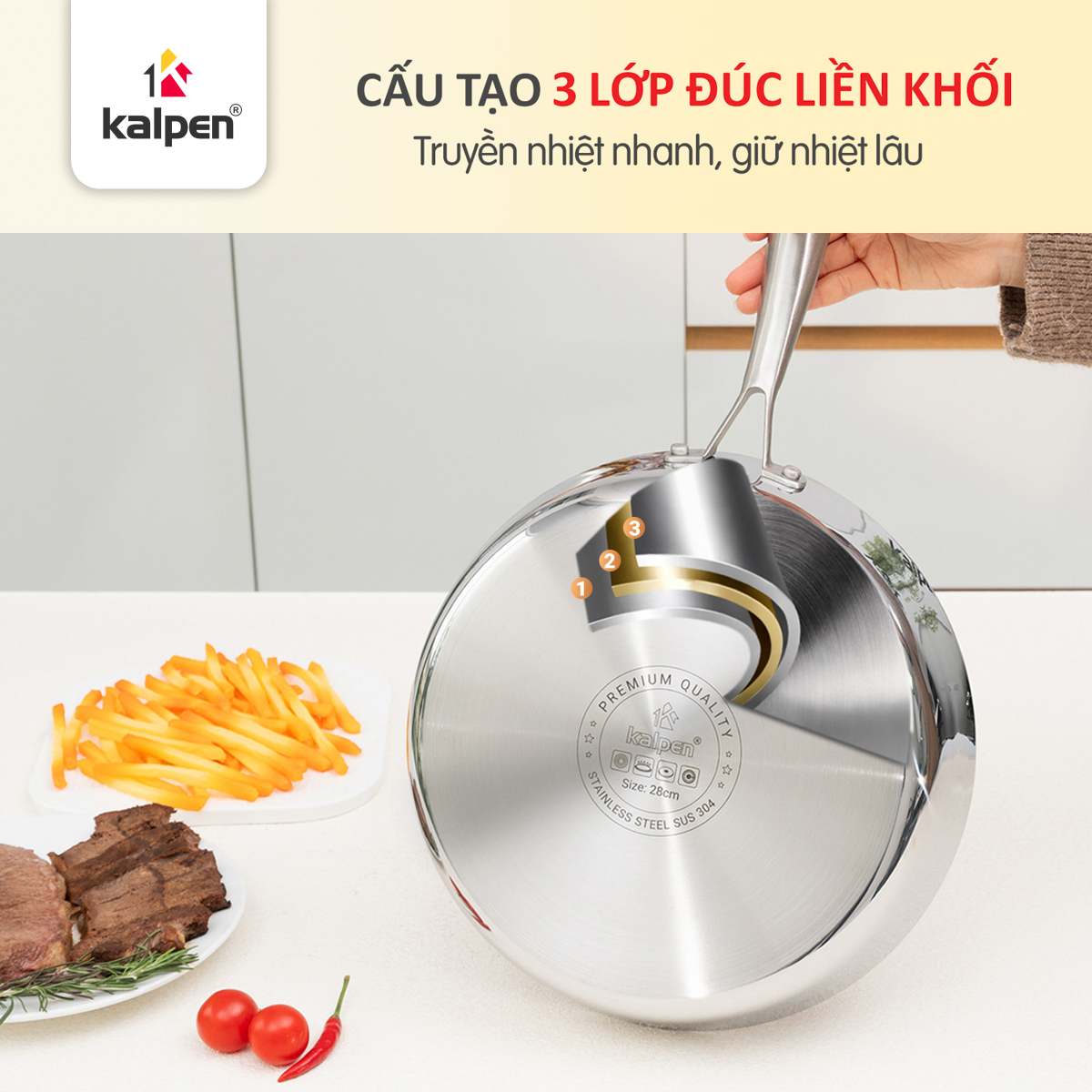 Sản phẩm có cấu tạo 3 lớp liền thân gồm lớp Inox 304 bên trong tiếp xúc trực tiếp với thực phẩm, lớp hợp kim nhôm dày ở giữa giúp dẫn và phân bổ nhiệt nhanh chóng, lớp Inox 430 bên ngoài tiếp xúc với mặt bếp, mang lại hiệu suất nấu nướng cao và tiết kiệm nhiên liệu.