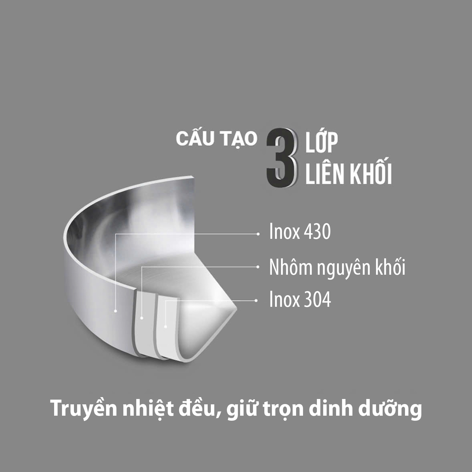 Chảo được cấu tạo 3 lớp liền thân gồm Inox 304 bên trong tiếp xúc trực tiếp với thực phẩm, lớp nhôm nguyên khối ở giữa giúp lan nhiệt nhanh và đều, cùng lớp Inox 430 bên ngoài tương thích với mọi loại bếp, đặc biệt là bếp từ.