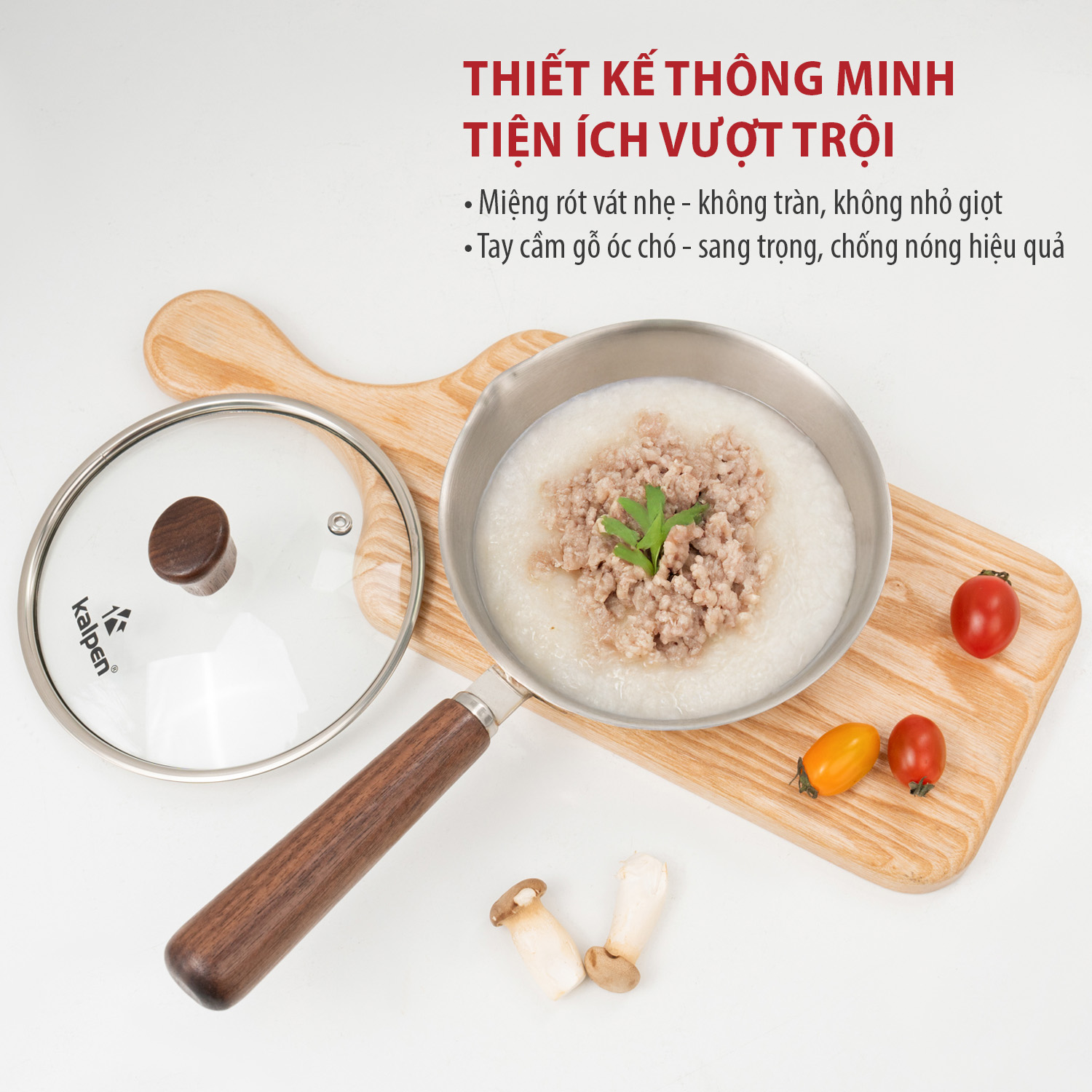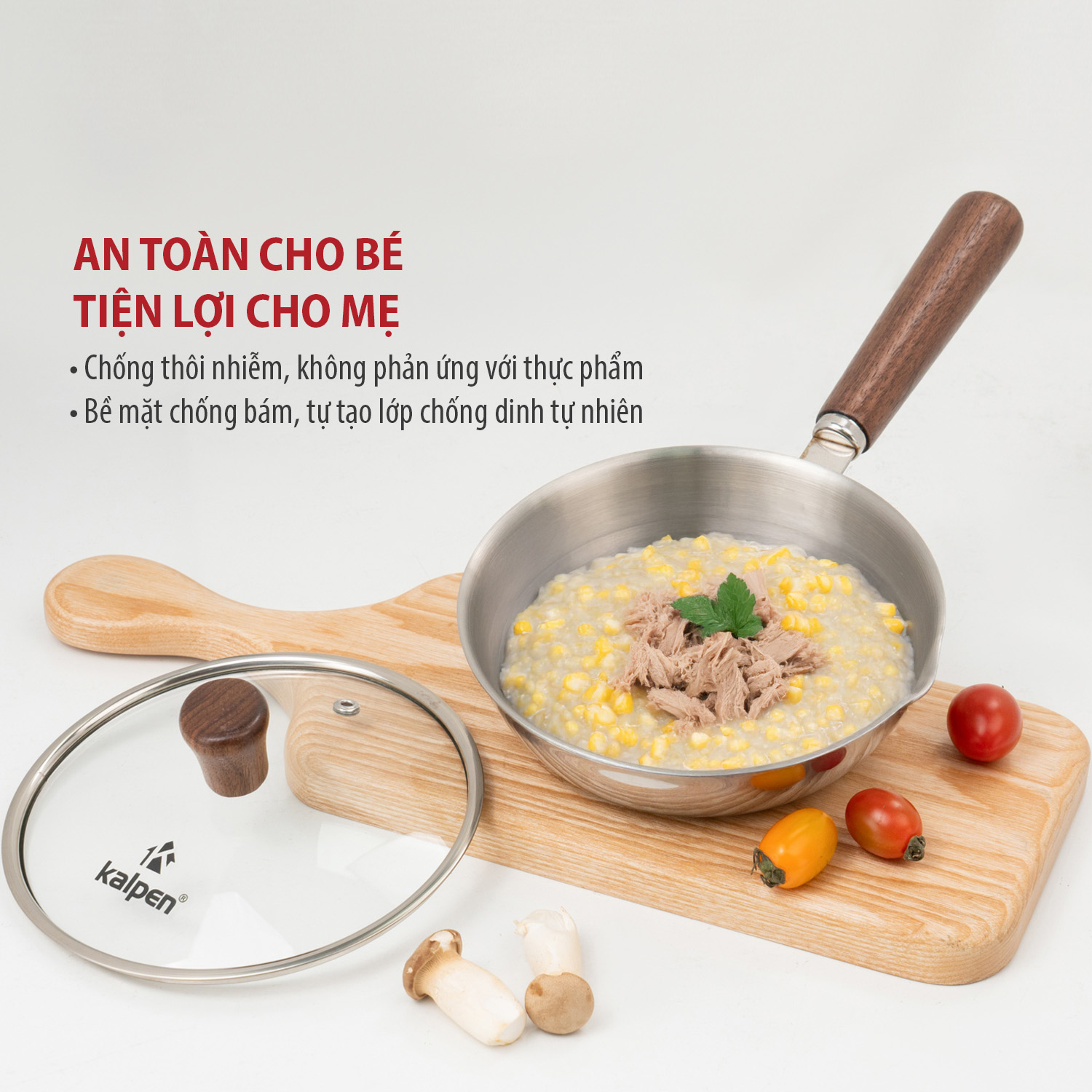 Chảo Kalpen Baby Rinmer sử dụng Inox 304 cao cấp, có khả năng chống oxy hóa, không thôi nhiễm chất độc hại. Chất liệu này tuyệt đối an toàn khi nấu cháo, bột, trứng hay các món ăn đầu đời cho trẻ nhỏ, đồng thời dễ vệ sinh và hạn chế bám bẩn.