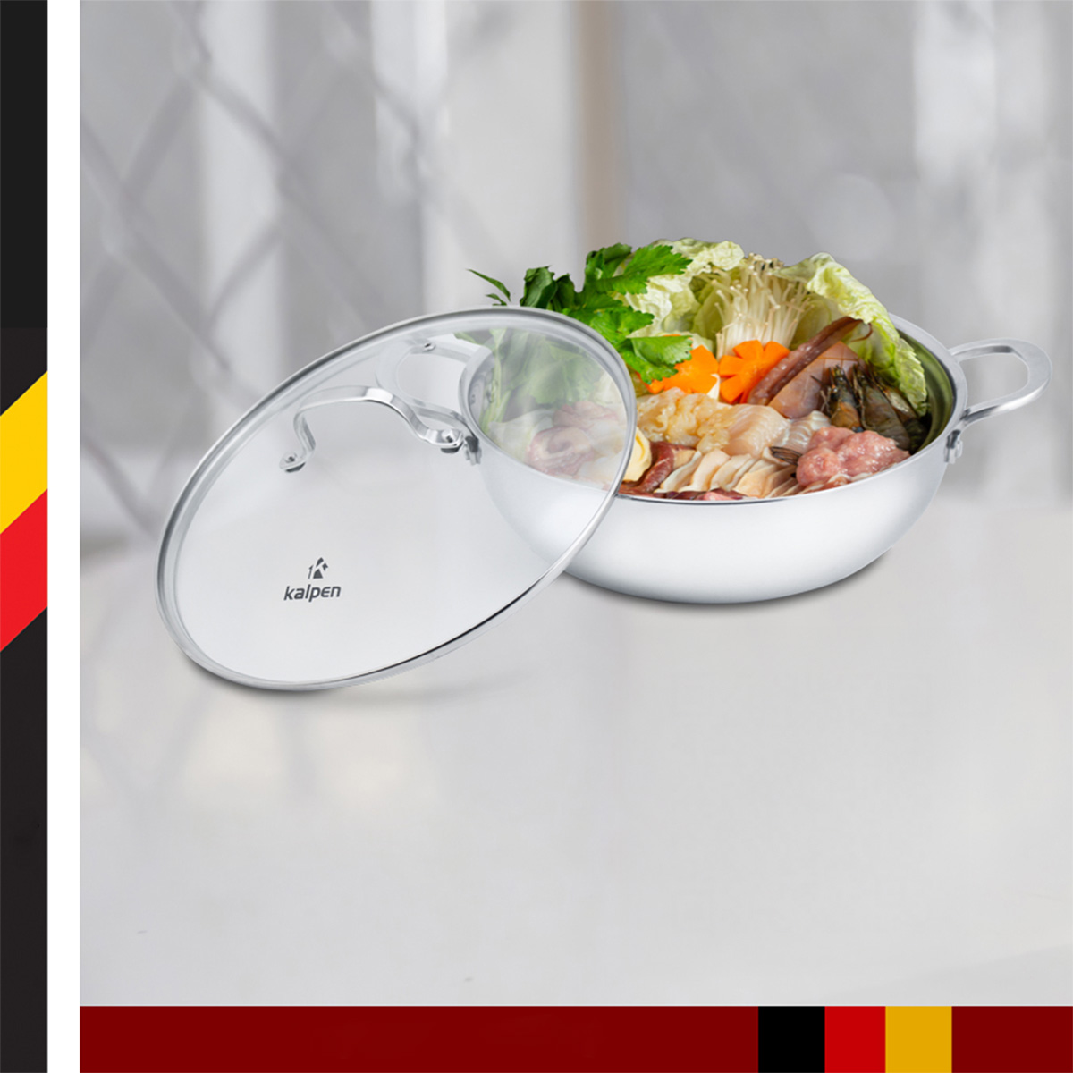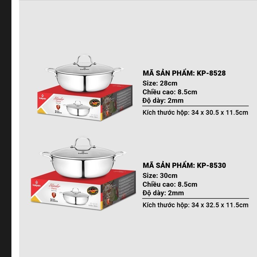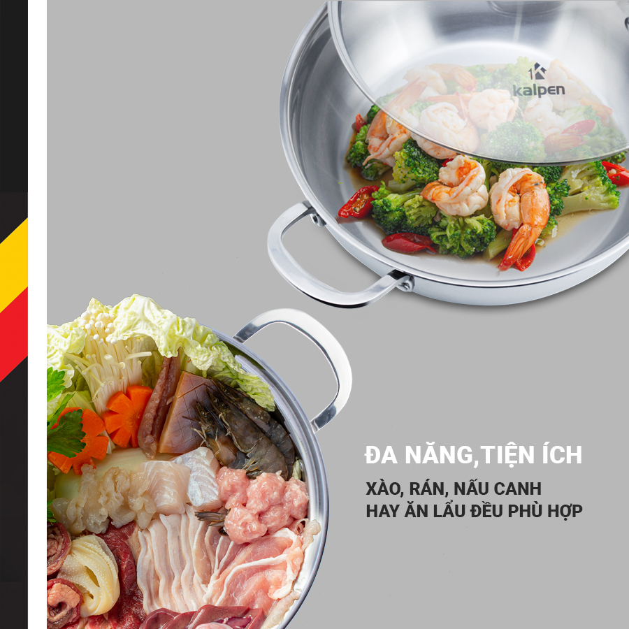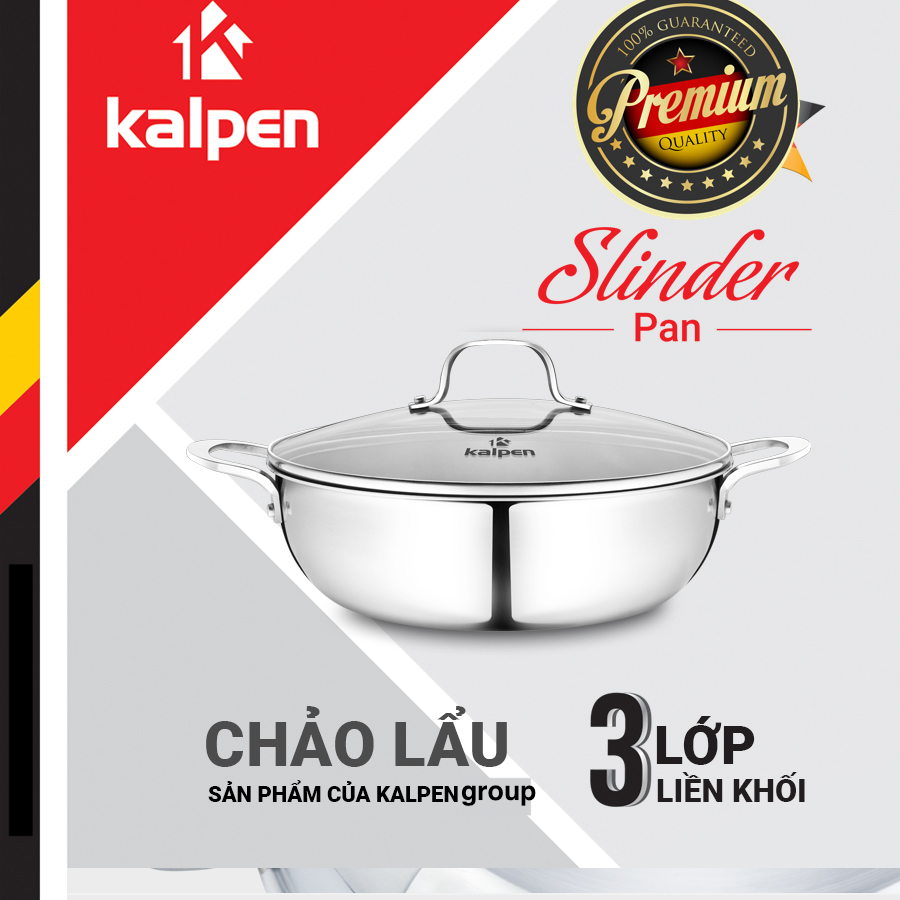 Chảo lẩu sản phẩm của thương hiệu Kalpen được thiết kế 3 lớp liền khối (từ ngoài vào trong lần lượt là các lớp: inox 430, hợp kim nhôm, inox cao cấp ) giúp cho truyền nhiệt đều và giữ nhiệt được lâu hơn. Ngoài ra inox cao cấp tiếp xúc trực tiếp với thực phẩm thì sẽ giúp an toàn với sức khỏe hơn, không bị nhiễm từ; inox 430 là lớp ở bên ngoài cũng giúp bắt từ tốt hơn, nhờ đó là lượng nhiệt có thể được truyền nhanh hơn và lan tỏa đều ở mọi vị trí của chảo lẩu.