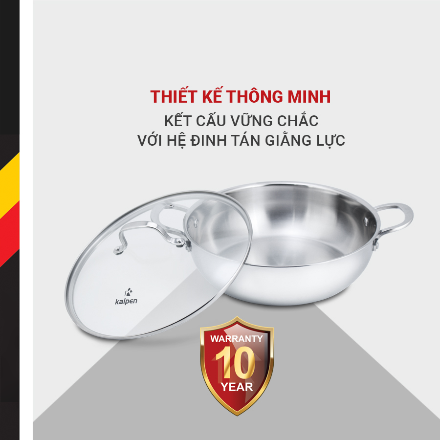 Thiết kế thông minh kết cấu vững chắc với hệ đinh tán giằng lực được bảo hành 10 năm, về ưu điểm này cũng sẽ giúp nâng cao tuổi thọ của sản phẩm và bạn hoàn toàn yên tâm về những thiết kế thông minh nhưng không kém phần chắc chắn được thiết ngay trong chính chiếc chảo lẩu thương hiệu hiệu Kalpen này.