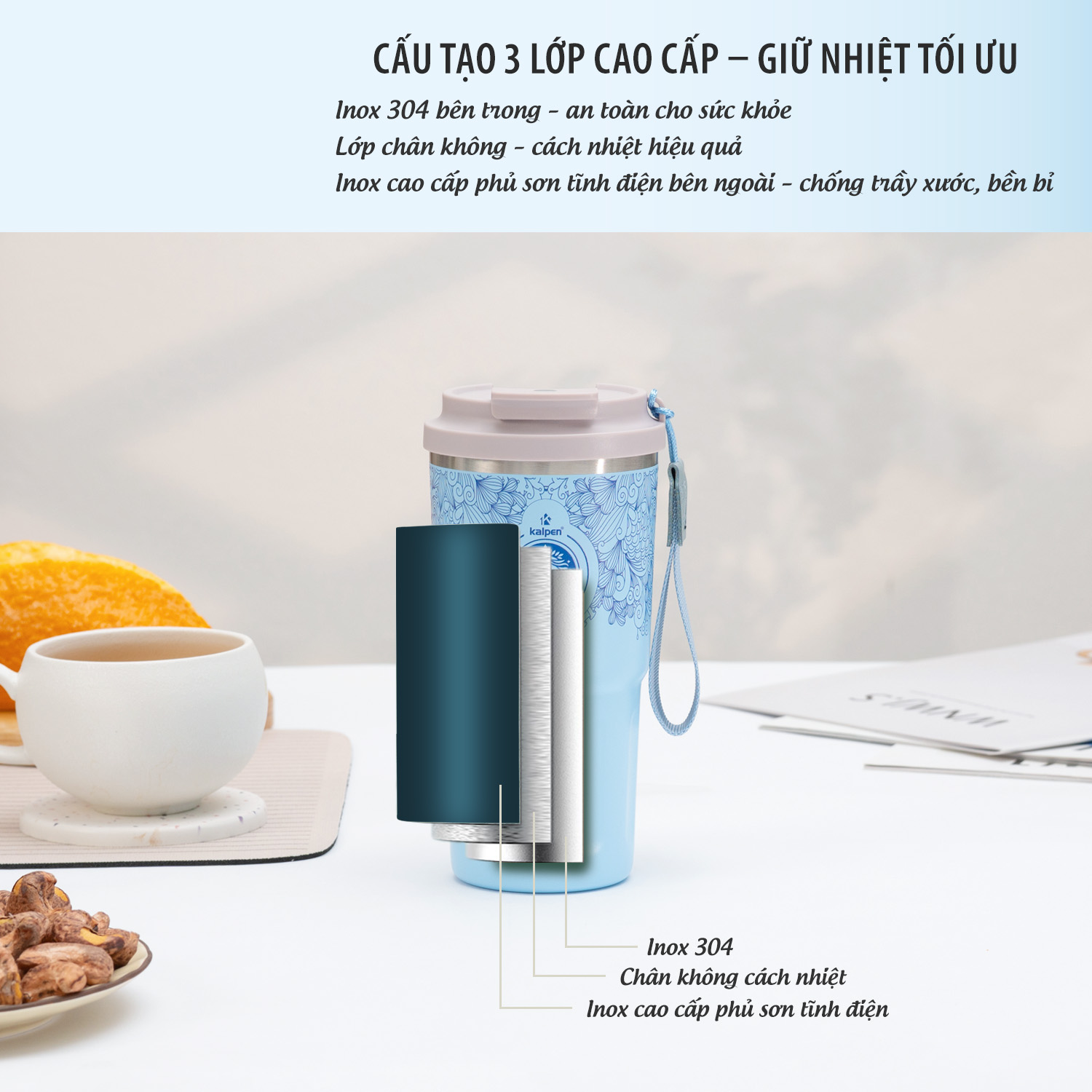 Cốc giữ nhiệt inox Kalpen E1, E2 có cấu tạo 3 lớp: