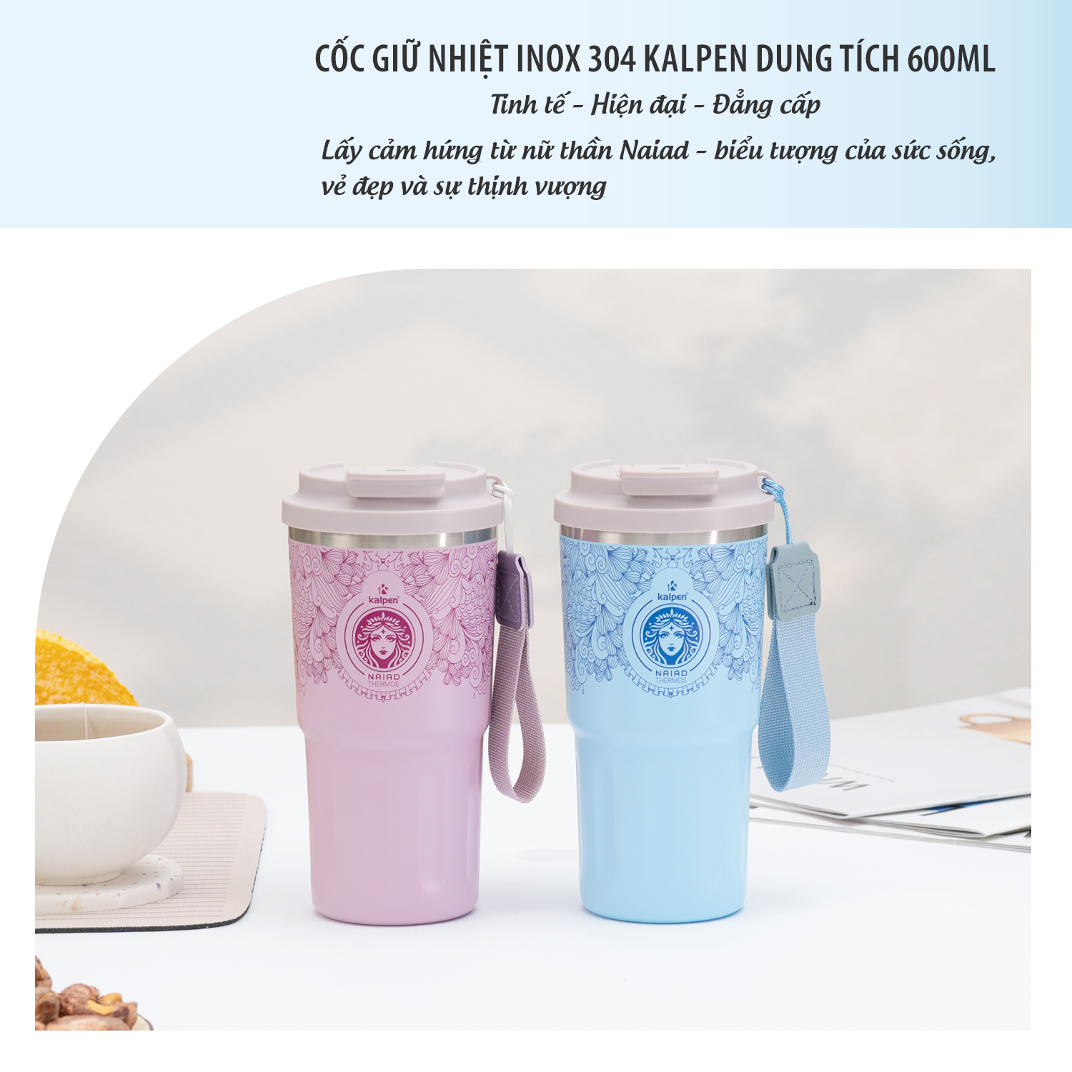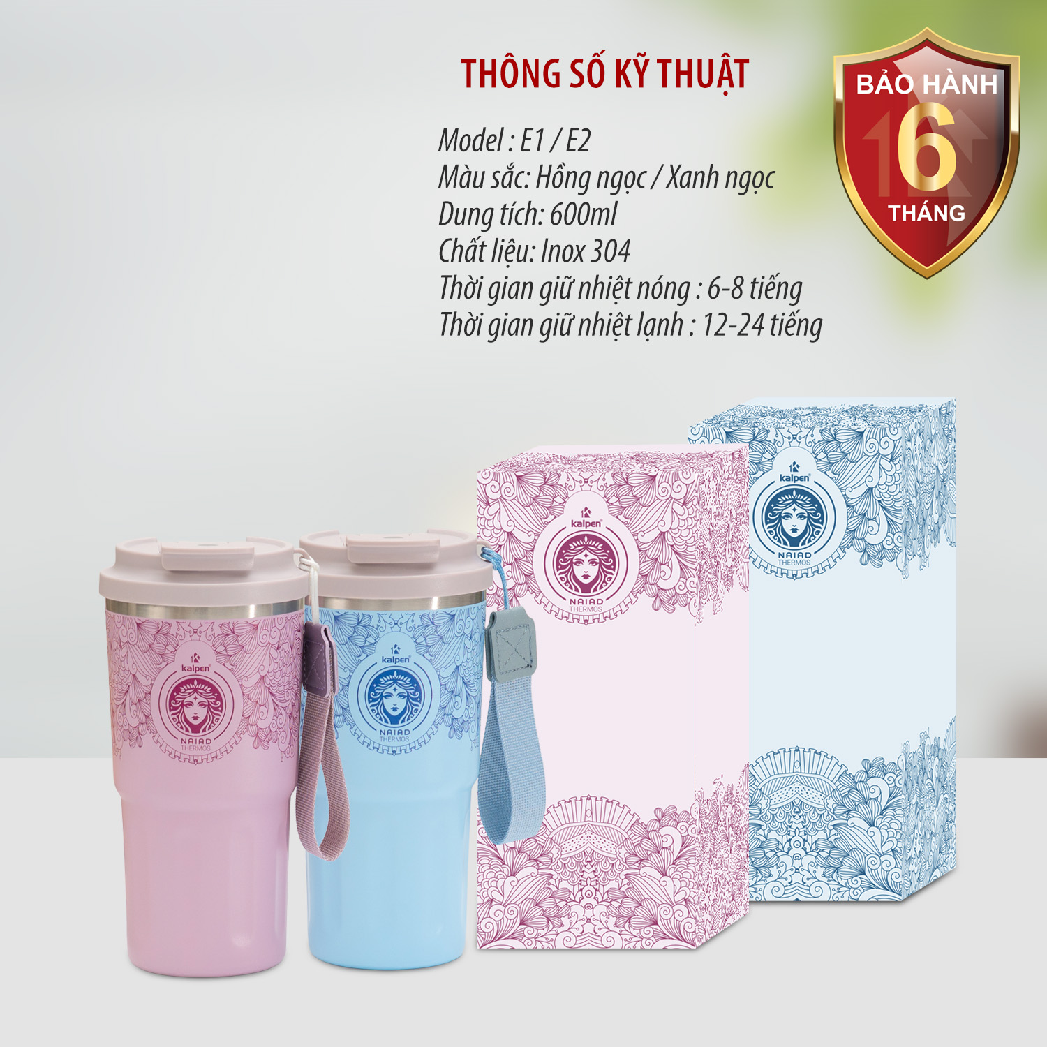 Cốc giữ nhiệt inox Kalpen E1, E2 có thiết kế nhỏ gọn với dung tích 600ml phù hợp sử dụng cho cá nhân. Bên ngoài được phủ ceramic kết hợp công nghệ in 3D thời trang với họa tiết nữ thần cùng 2 tông màu hồng ngọc và xanh ngọc mang đến cho sản phẩm sự sang trọng và thời trang. Sản phẩm không chỉ có tính tiện ích sử dụng ở mọi nơi mà còn là một vật dụng cá nhân thể hiện cá tính thanh lịch, trẻ trung của người sử dụng.