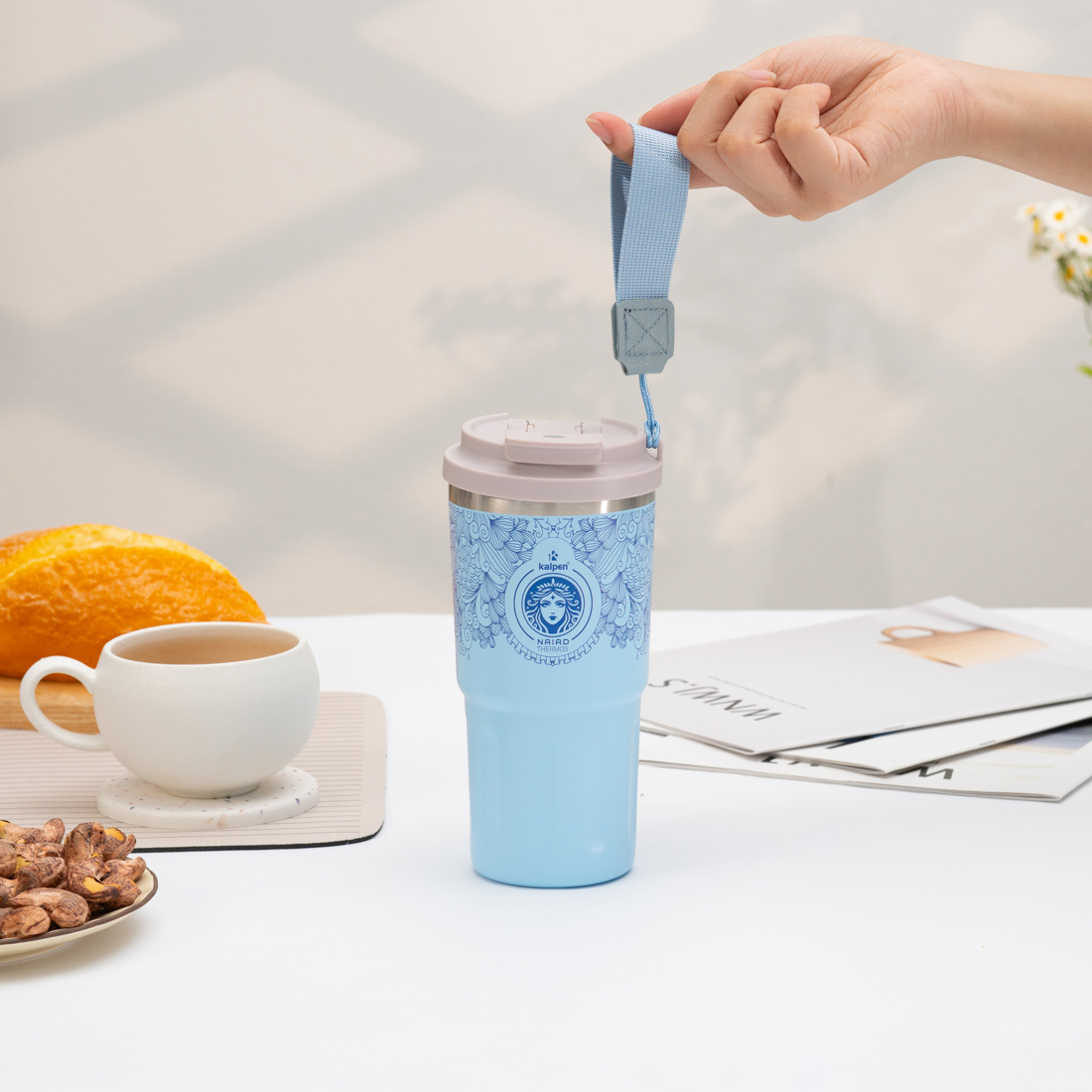 Quai xách được thiết kế thời trang cùng tông màu và hài hòa với cốc giúp bạn dễ dàng mang cốc đi mọi nơi một cách thuận tiện và thoải mái.