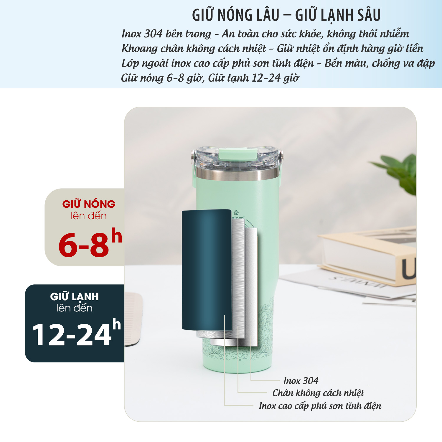 Cốc giữ nhiệt Kalpen E5, E6 được làm từ inox 304 với cấu tạo 3 lớp: