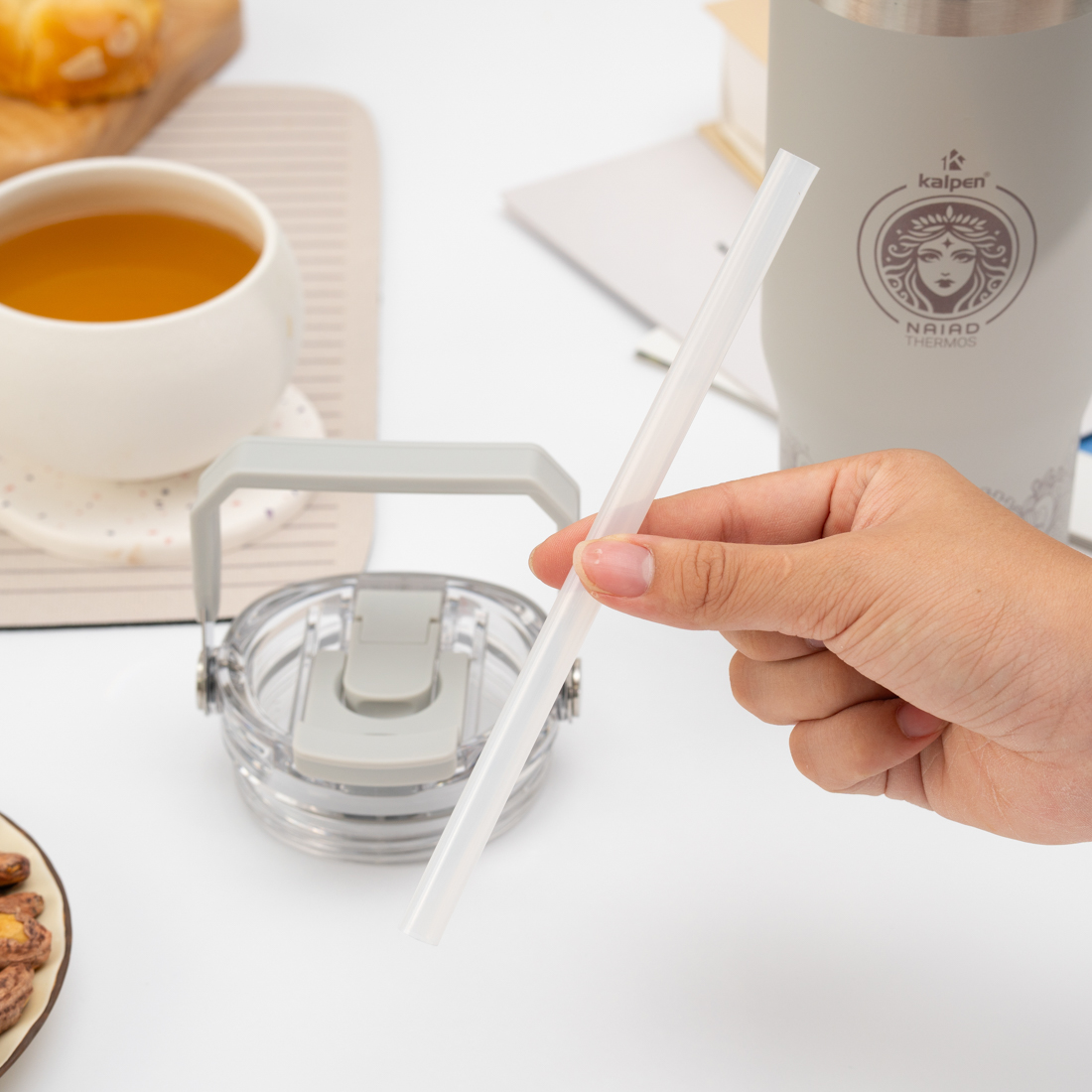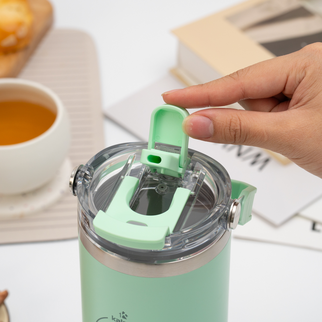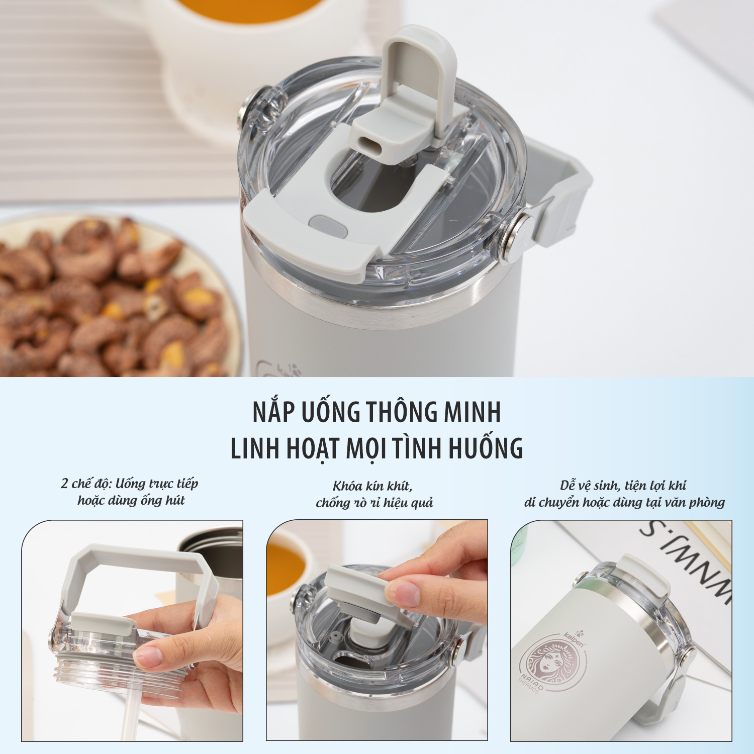 Nắp cốc giữ nhiệt Kalpen E5, E6 dễ dàng tháo rời, được thiết kế chống rò rỉ nên người dùng hoàn toàn yên tâm và thoải mái khi xách theo bên mình hoặc bỏ vào trong ba lô, túi xách chứa các đồ khác. Nắp cốc thông minh có khe để người dùng uống nước trực tiếp từ bình hoặc có thể cắm ống hút để tiện sử dụng.