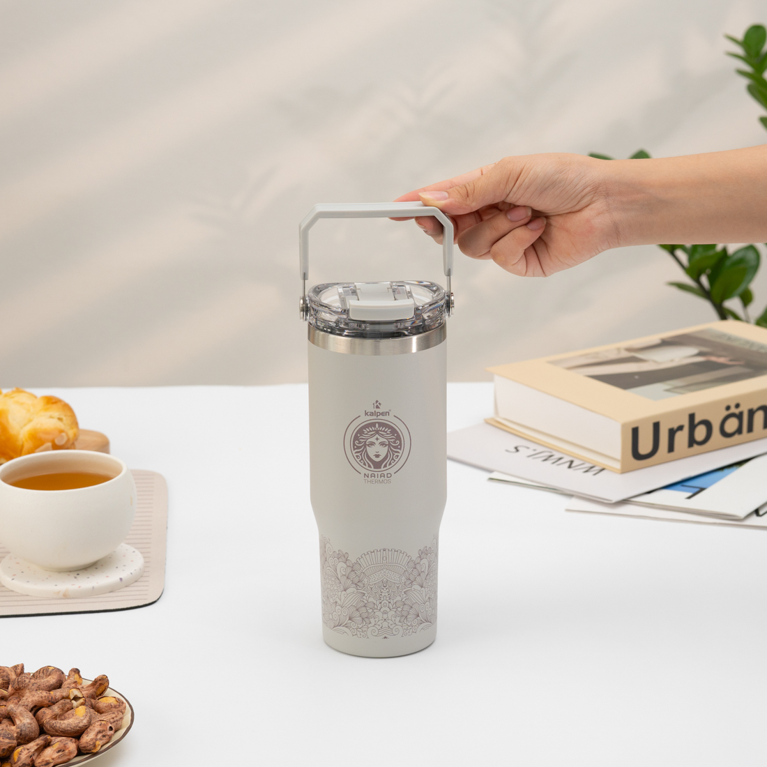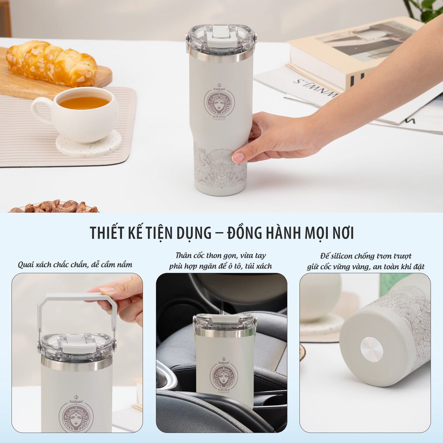 Dung tích lớn 900ml, có quai xách nhưng cốc giữ nhiệt Kalpen E5, E6 rất nhỏ gọn và có tính ứng dụng cao. Dung tích này phù hợp để người làm văn phòng mang thức uống đi làm hàng ngày, người tập gym, thể thao hoặc có thể mang đi cho các buổi dã ngoại, cắm trại…