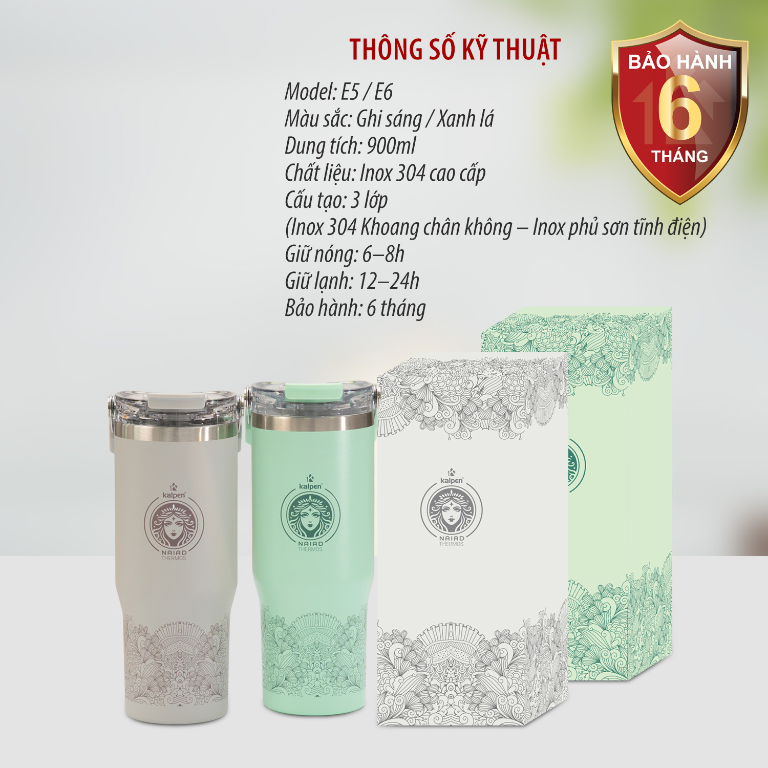 Nếu như cốc giữ nhiệt Kalpen E1, E2, E3, E4 có tông màu ngọt ngào, nhẹ nhàng thì Cốc giữ nhiệt inox 304 Kalpen E5, E6 dung tích 900ml với màu sắc ghi sáng và xanh lá sẽ rất phù hợp để các anh mang thức uống đi làm, đi chơi thể thao, đi tập…