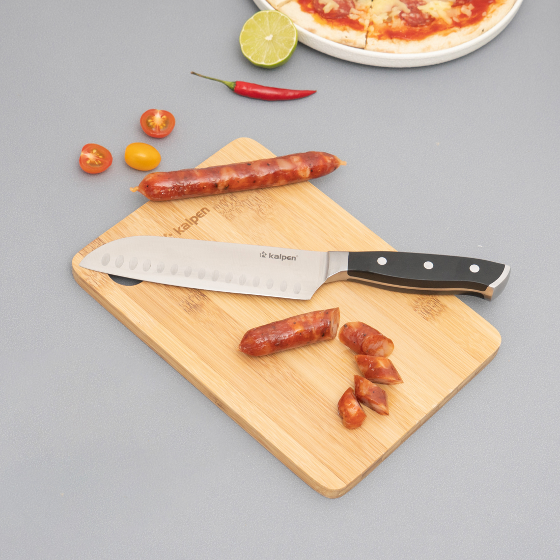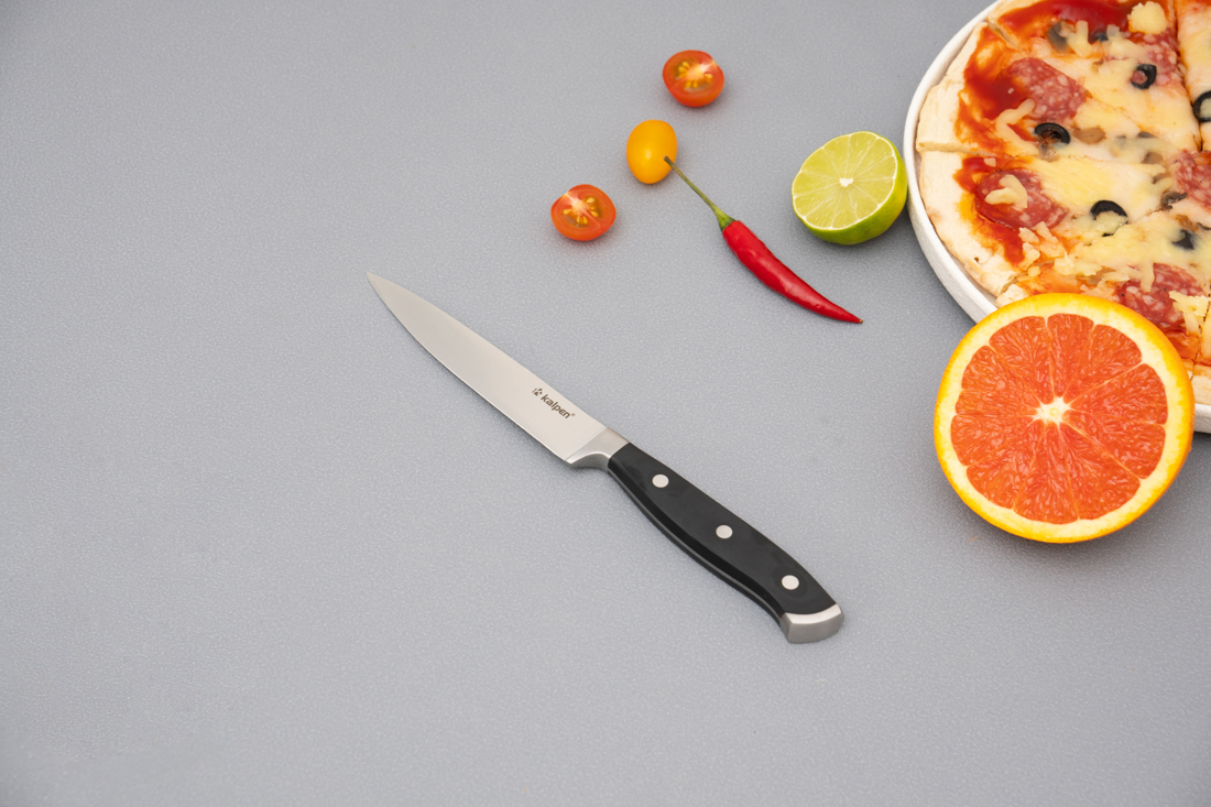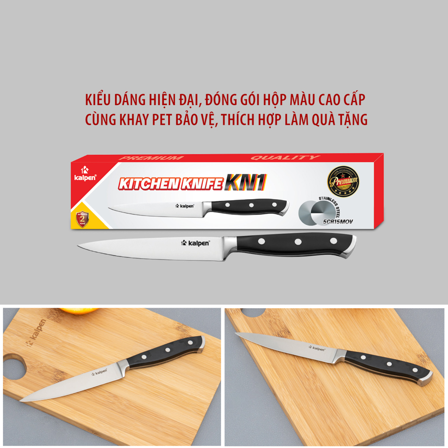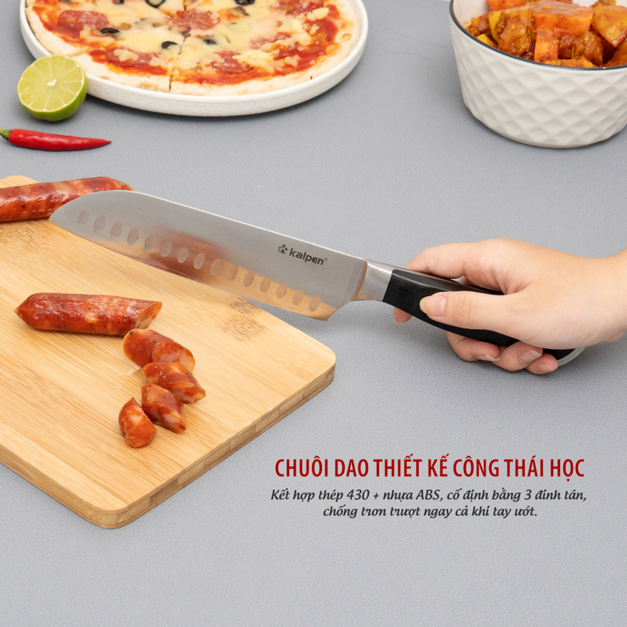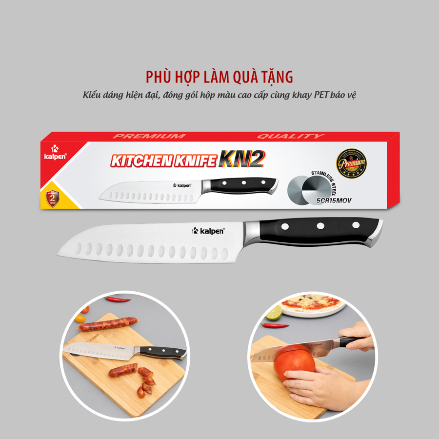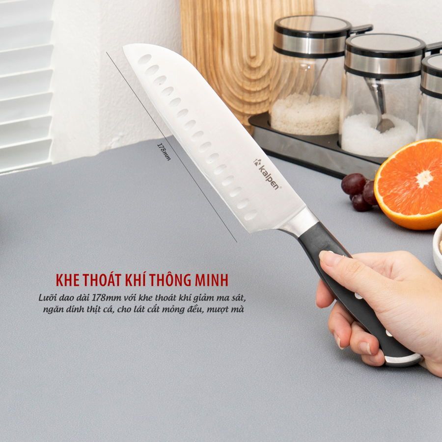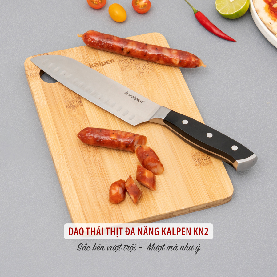 | Dao đa năng Kalpen KN2 | Lưỡi dài 178 mm, dày 3 mm, thép 5Cr15MoV; cán ABS + thép 430, 3 đinh tán cố định | Cắt, thái, chặt nhẹ, lọc xương, cắt thịt – cá – rau củ | Rãnh thoát khí chống dính, lưỡi sắc chuẩn xác, cầm đầm tay, không trơn trượt |