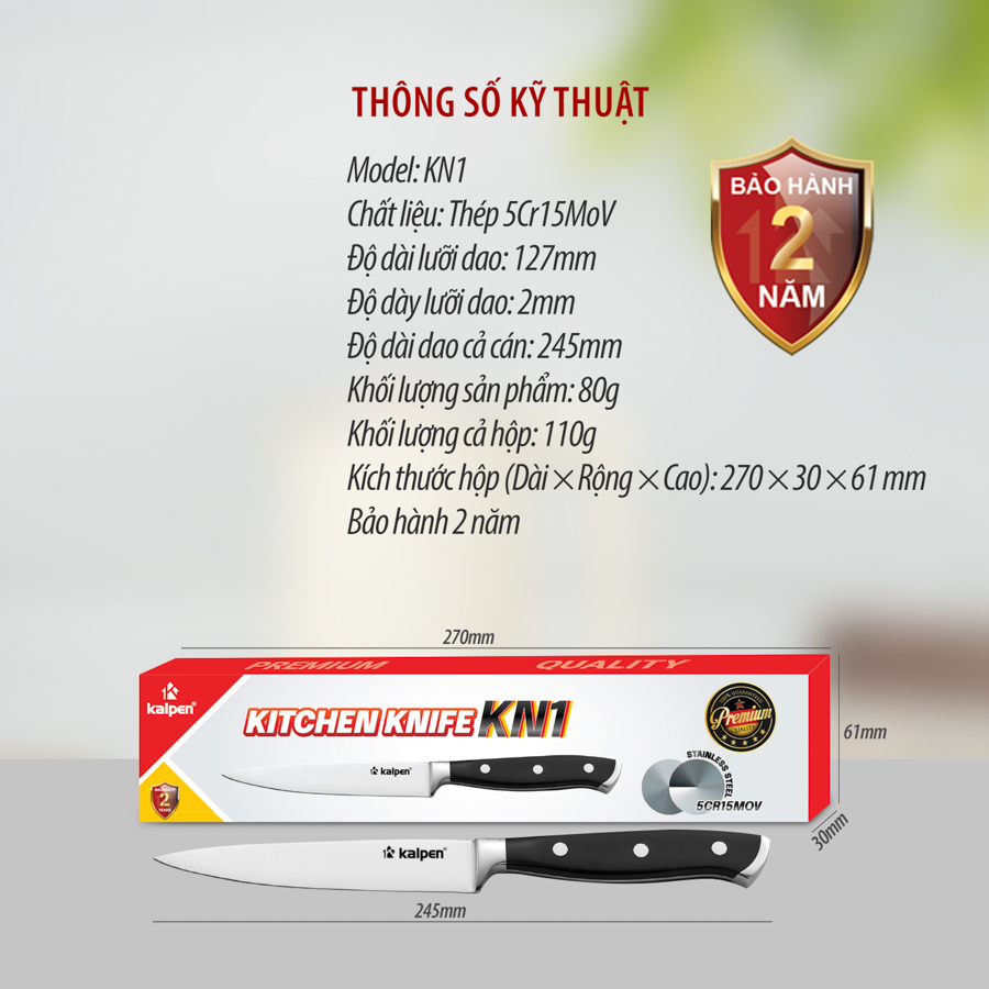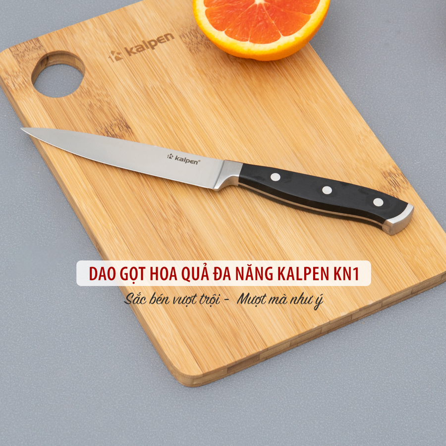 | Dao gọt hoa quả Kalpen KN1 | Lưỡi dài 127 mm, dày 2 mm, thép 5Cr15MoV chứa Crom, Molybdenum, Vanadium | Gọt vỏ, tỉa hoa, cắt trang trí, sơ chế hoa quả | Nhỏ gọn, sắc bén, mài thủ công chính xác, không gỉ |