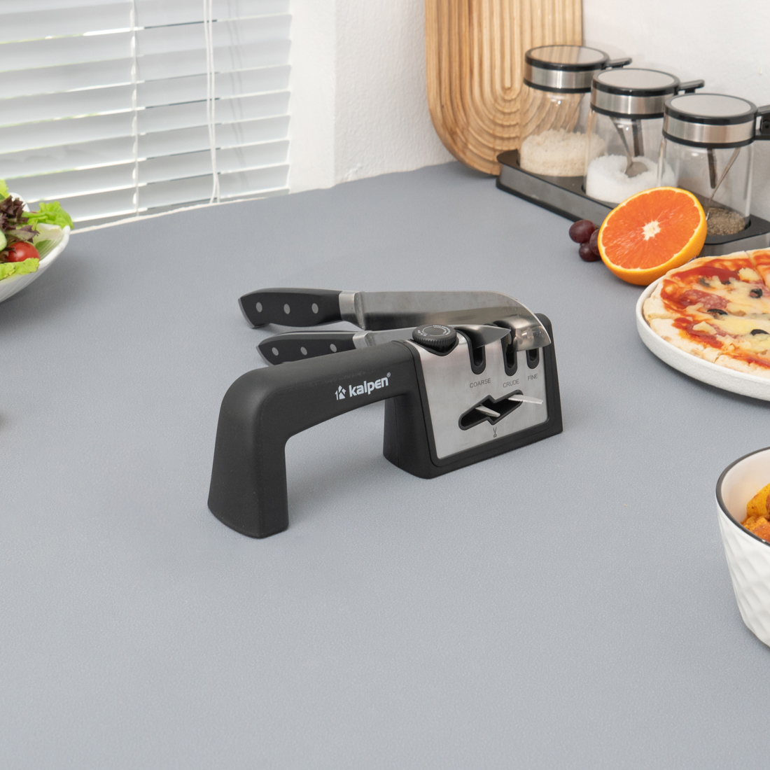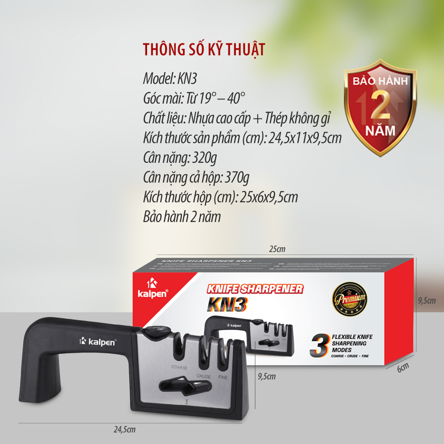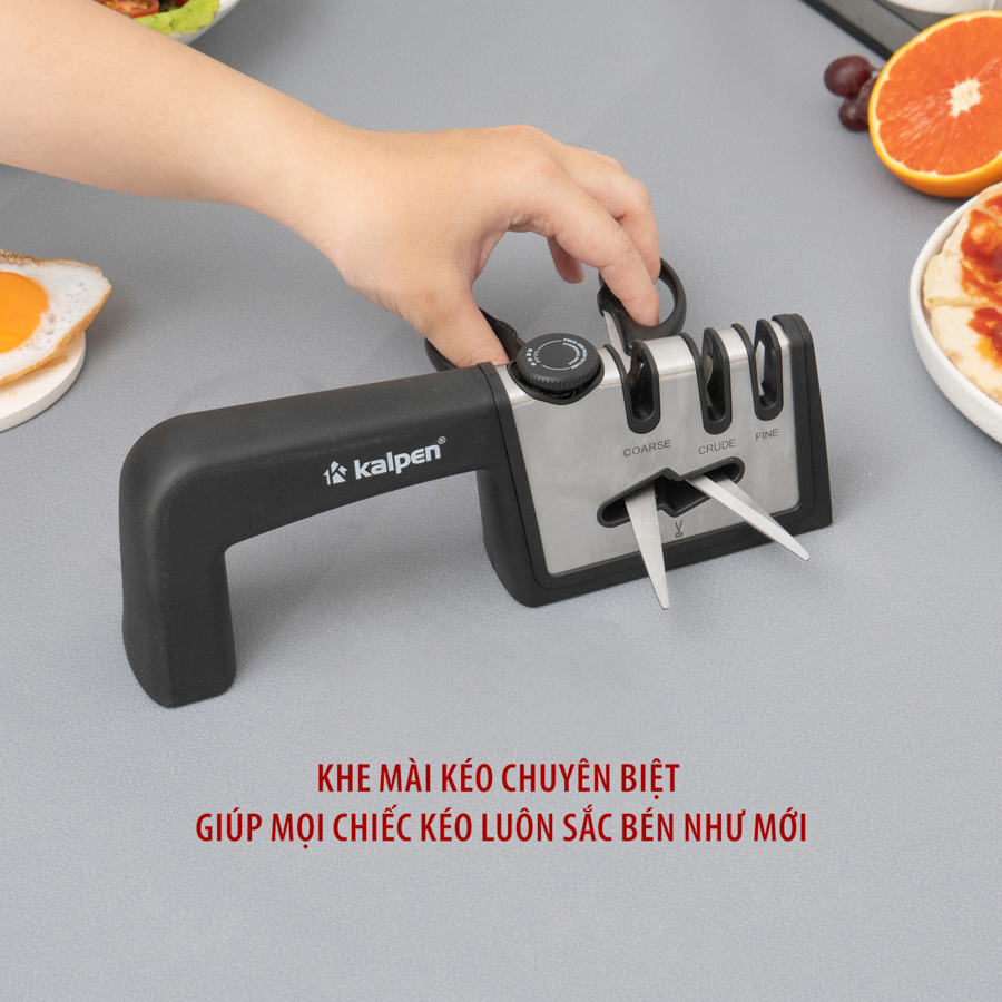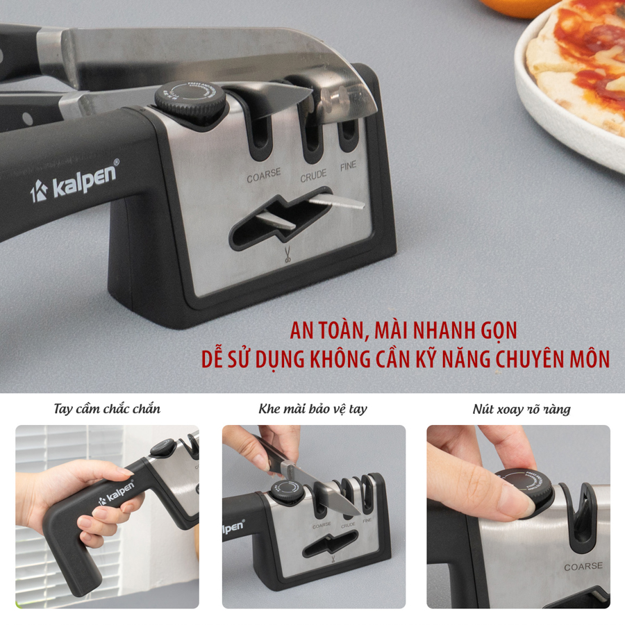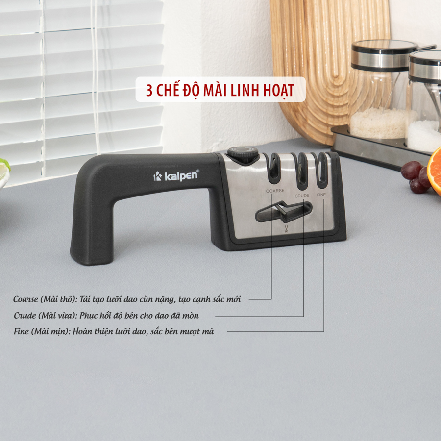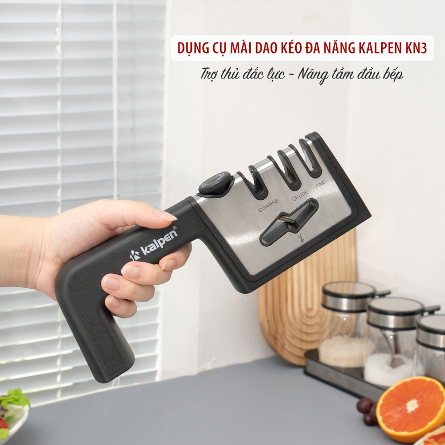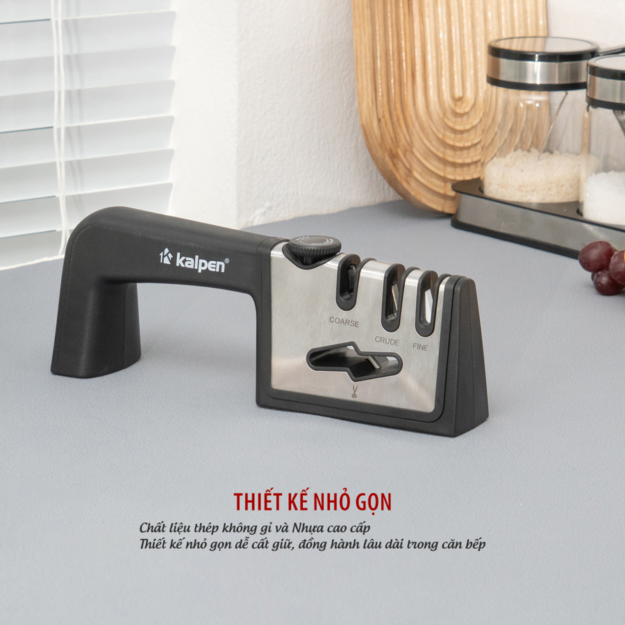 | Dụng cụ mài dao Kalpen KN3 | 3 rãnh mài: Coarse – Crude – Fine, thân thép không gỉ + nhựa ABS | Mài và phục hồi độ sắc bén cho dao kéo | 3 cấp độ mài từ thô đến mịn, tay cầm chắc chắn, đế chống trượt |