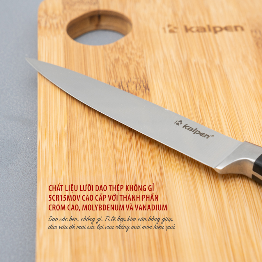 Bộ dao Kalpen sử dụng thép không gỉ 5Cr15MoV cao cấp, nổi tiếng với độ cứng và khả năng chống oxy hóa vượt trội.