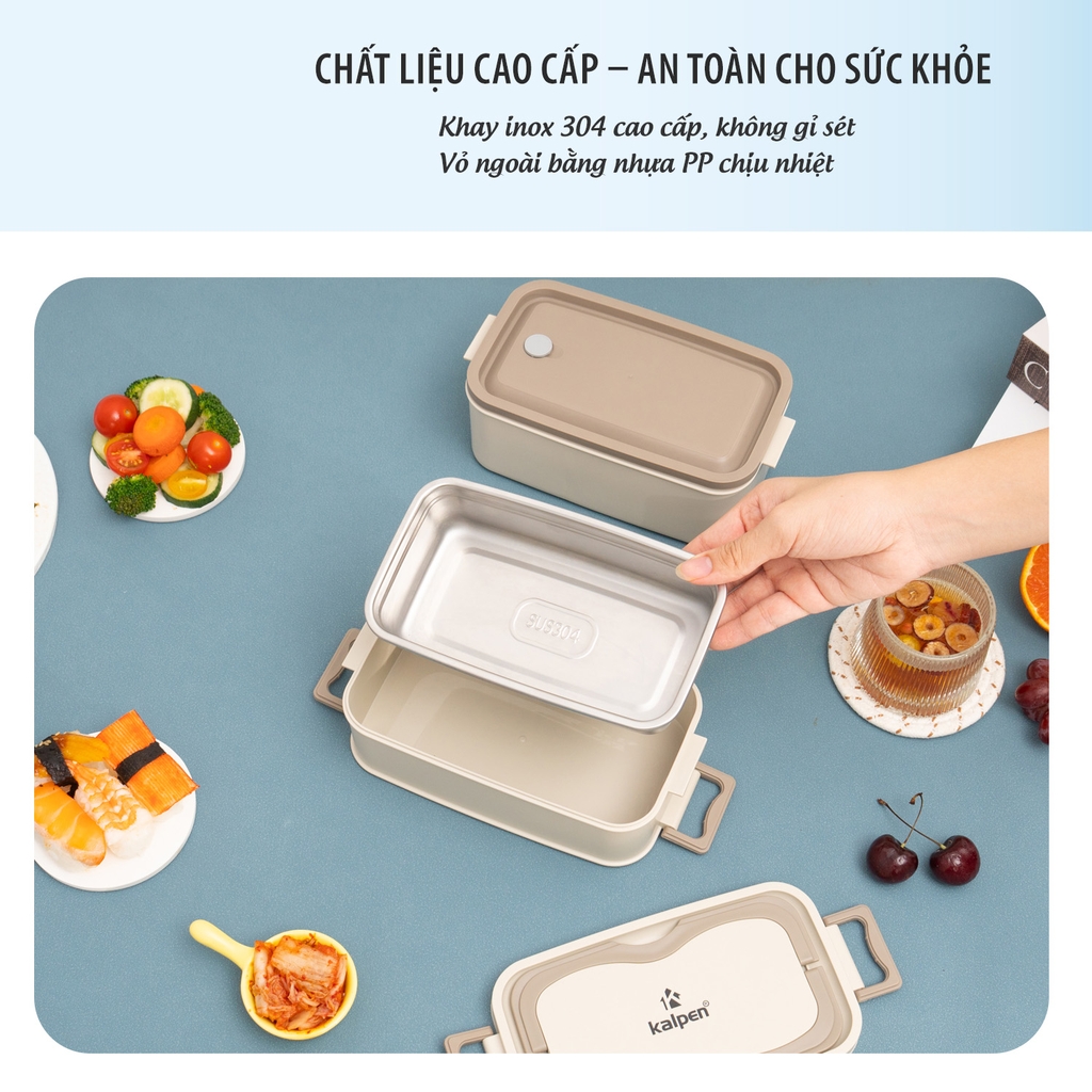 Phần ngăn bên trong của hộp cơm văn phòng Kalpen AR10 được làm từ inox 304 (SUS304) cao cấp, loại thép không gỉ được đánh giá cao về khả năng chống oxy hóa, không thôi nhiễm hóa chất độc hại vào thực phẩm. Inox 304 được sử dụng rộng rãi trong ngành y tế và chế biến thực phẩm, nên bạn hoàn toàn yên tâm về độ an toàn cho sức khỏe.