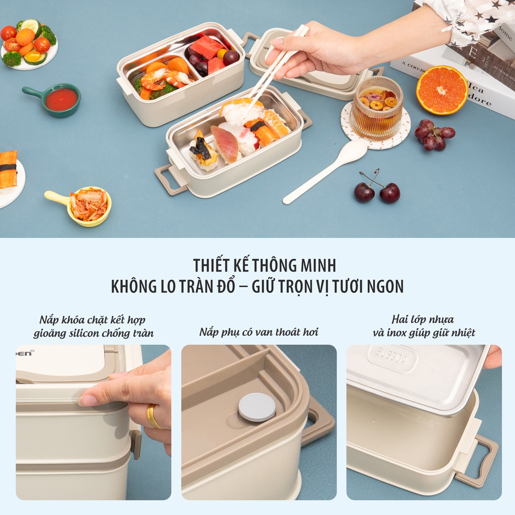 Tầng dưới 600 ml có vách chia ngăn: Giúp bạn đựng cơm và món mặn riêng biệt, không bị trộn lẫn mùi hay vị.