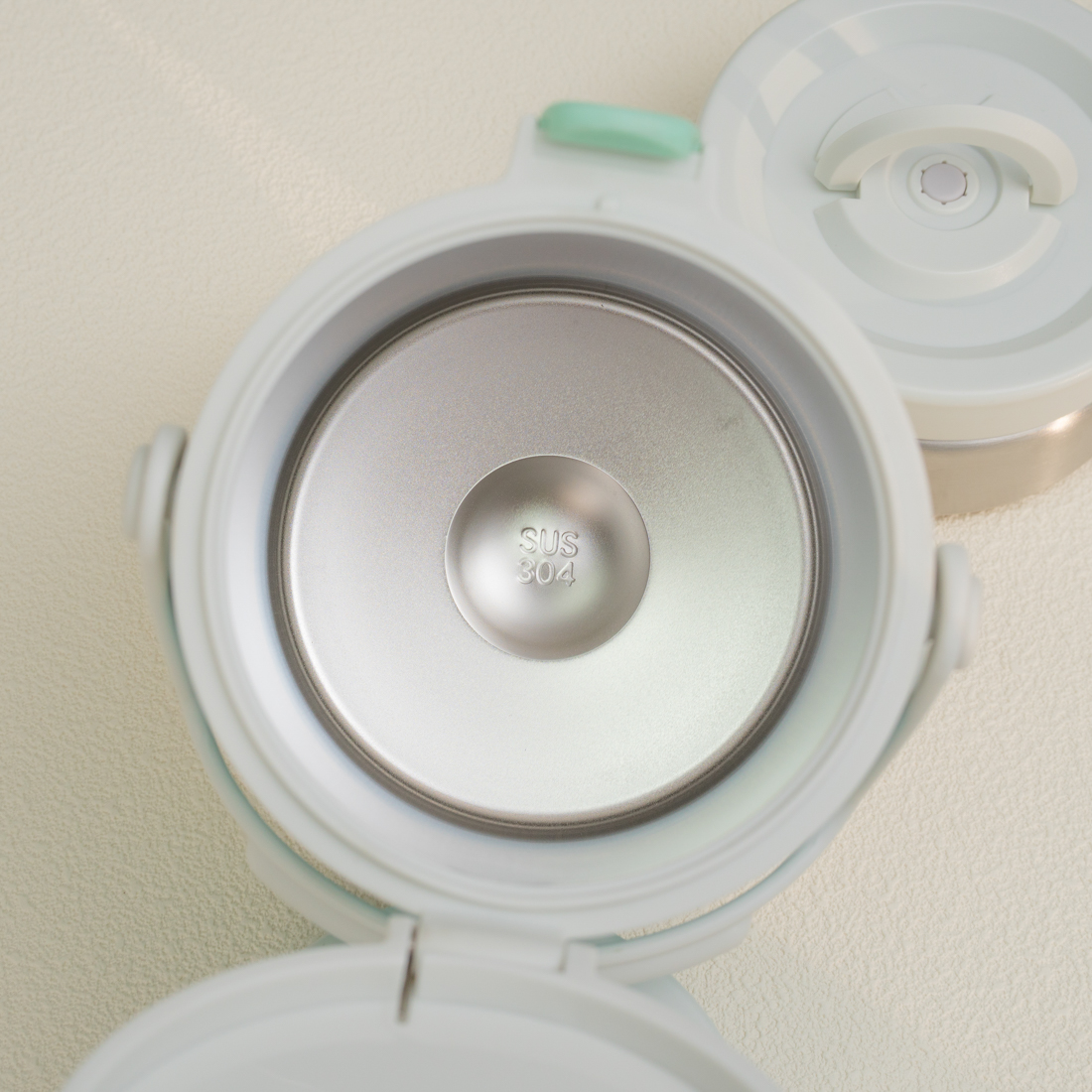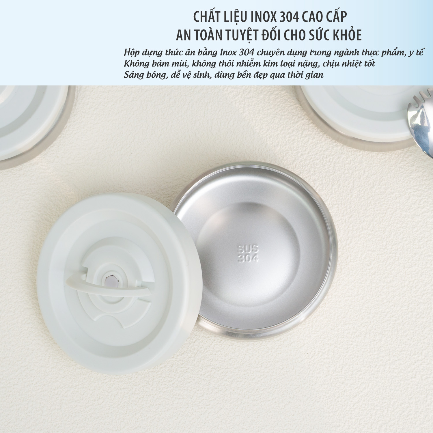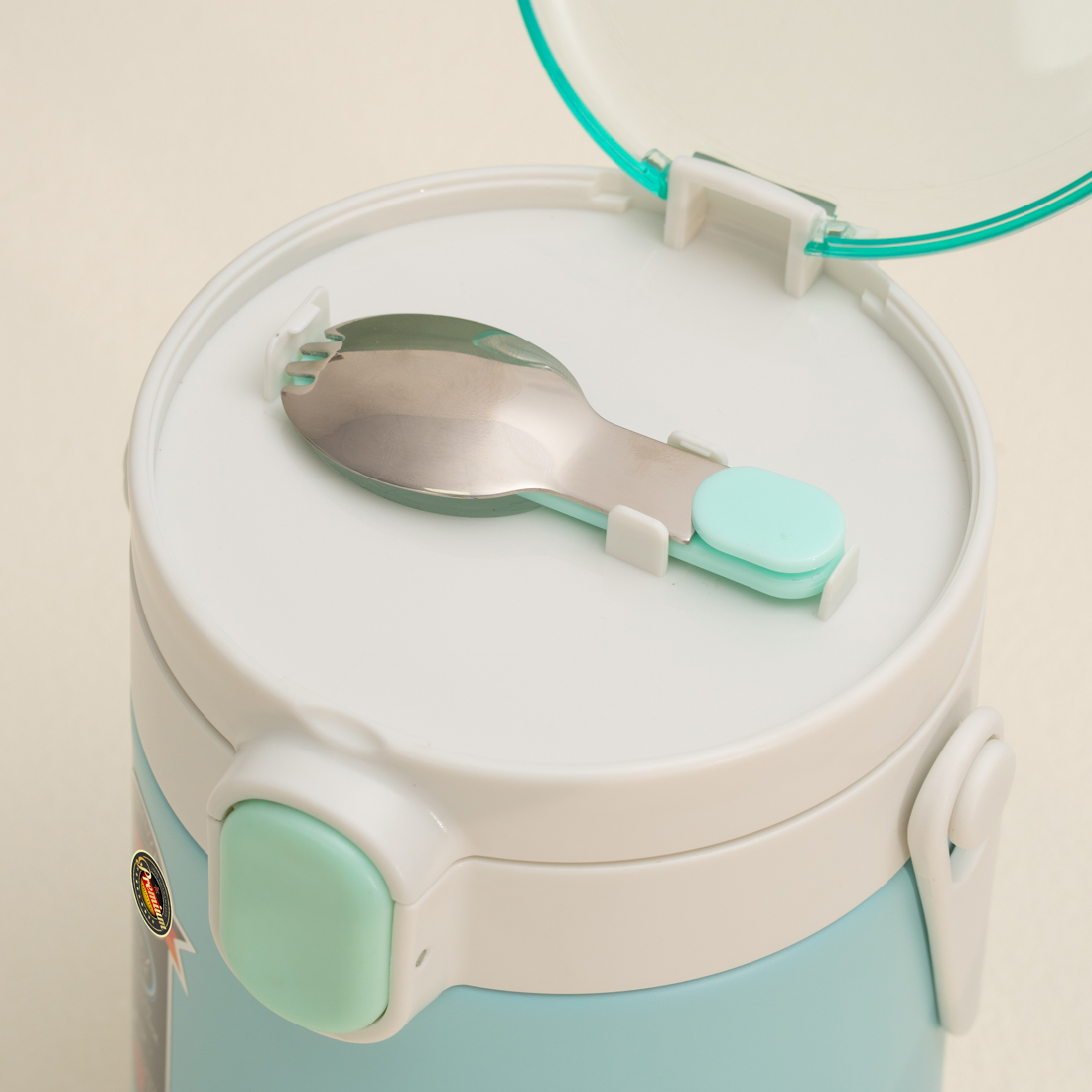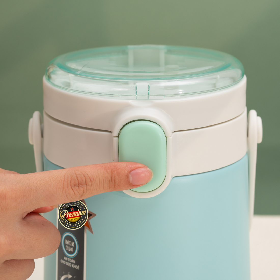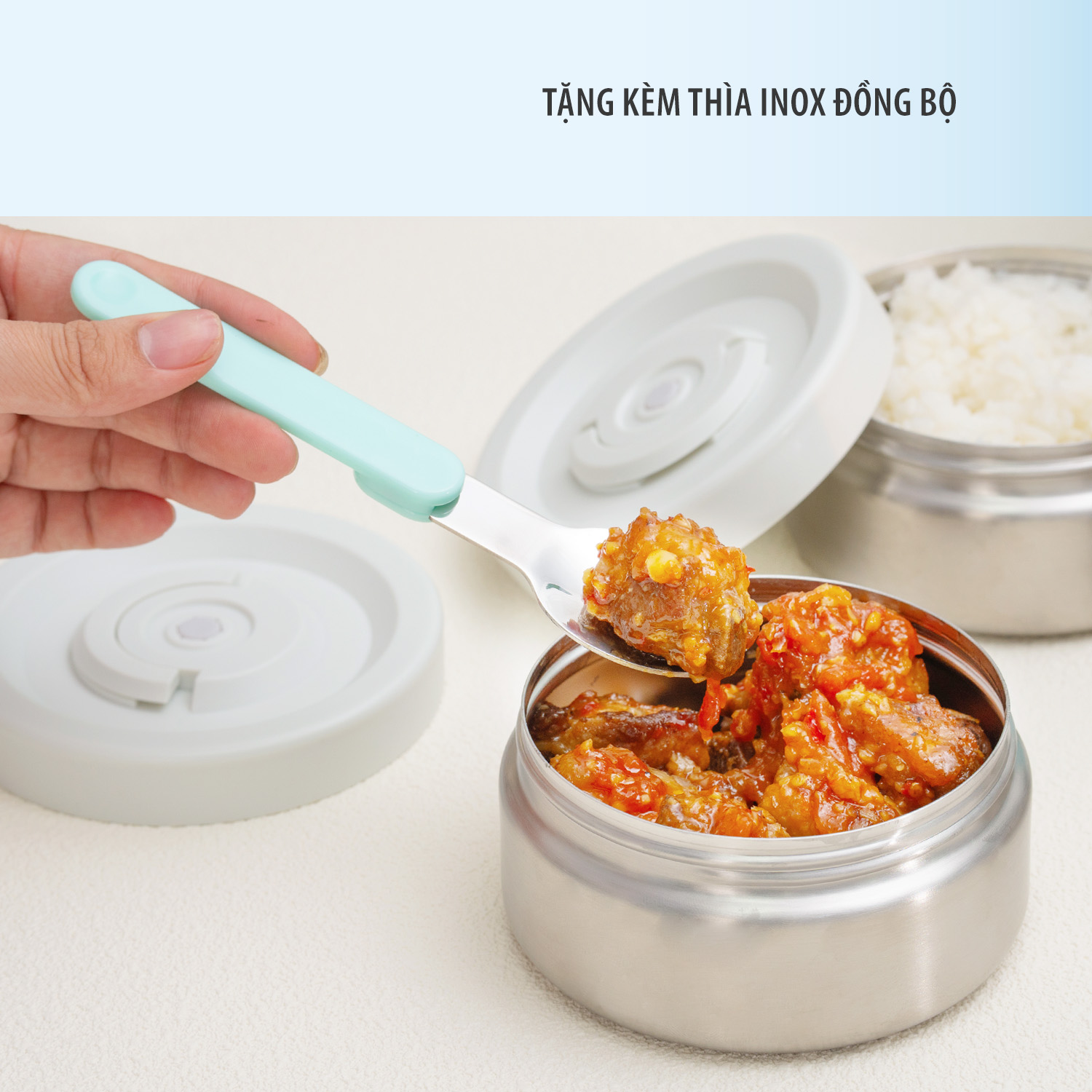 Đi kèm với hộp cơm là thìa inox 304 cao cấp nhỏ xinh gắn trên nắp bình ủ và 1 dây xách chắc chắn tiện lợi để treo xách đồ ăn và bảo vệ hộp cơm tránh móp méo khi va đập.