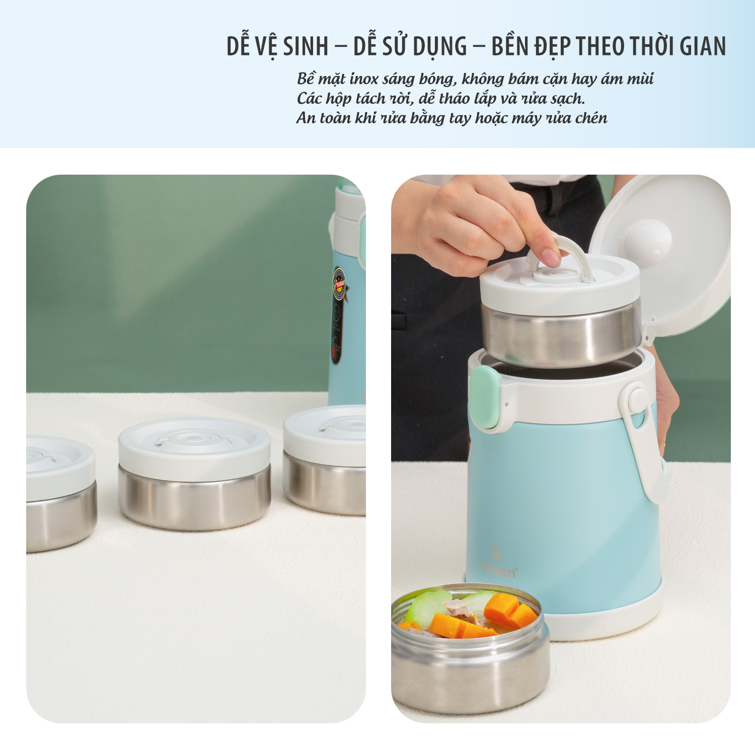 Hộp cơm giữ nhiệt Kalpen E7 dễ tháo lắp nên thuân tiện vệ sinh sau mỗi lần sử dụng.