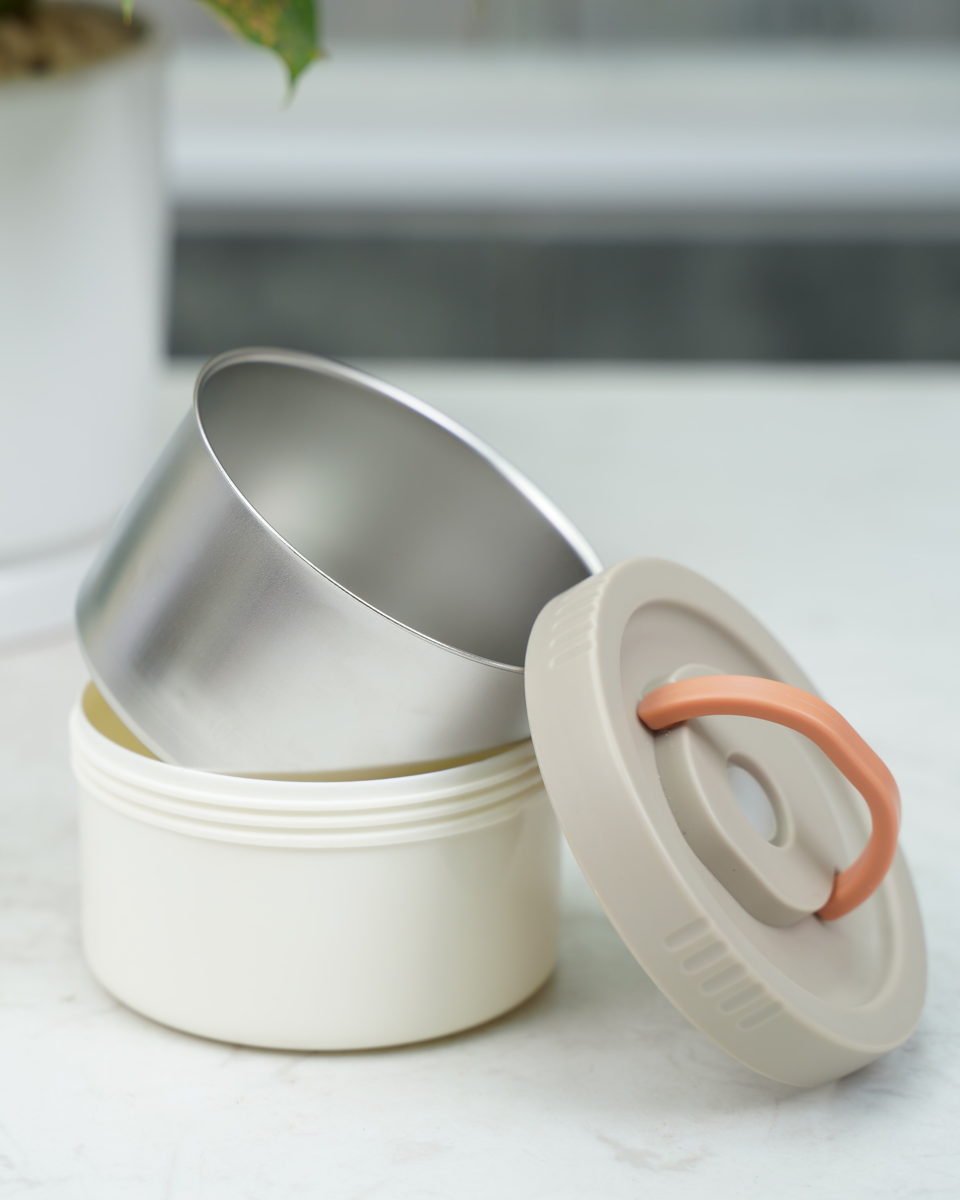 Hộp đựng thực phẩm có 2 lớp, lớp trong tiếp xúc với thực phẩm là inox 304 an toàn, lớp ngoài là nhựa cao cấp cách nhiệt. Thiết kế 2 lớp không chỉ giúp làm tăng hiệu quả và thời gian giữ nhiệt mà còn có tác dụng chống nóng bỏng khi sử dụng. Nắp hộp đựng thực phẩm có gioăng silicon tích hợp nút thoát hơi vô cùng kín giúp cho việc đựng các ăn chứa nhiều nước không bị trào ra ngoài.