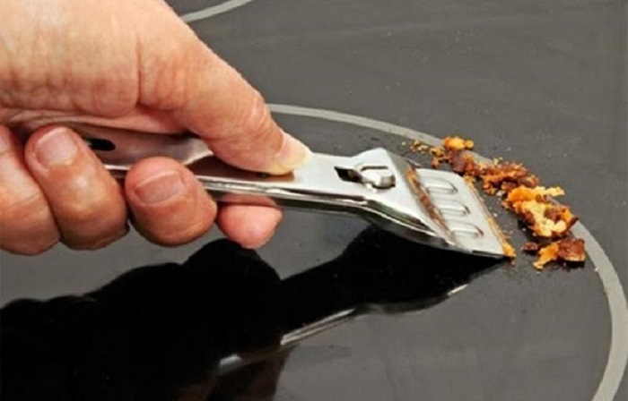 Lưu ý là sử dụng dao cạo chuyên dụng để tránh làm xước mặt kính bếp. Trường hợp không có dao cạo bạn có thể sử dụng bàn chải cũ, tuy nhiên sẽ không hiệu quả bằng dao cạo.