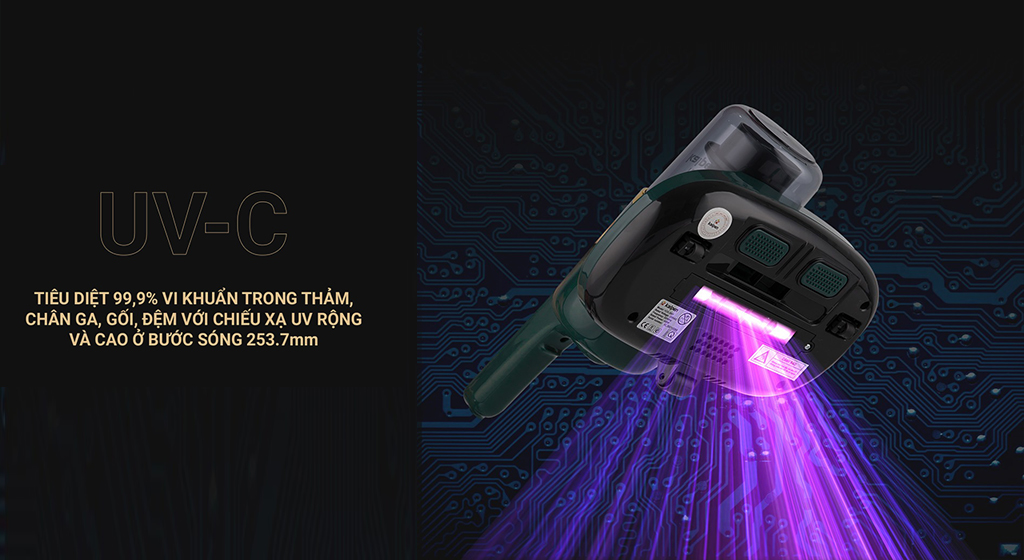 Trên Máy Hút Bụi Nệm Giường của Kalpen được trạng bị 1 bóng đèn UV. Bóng đèn này khi sử dụng sẽ phát ra một chùm tia cực tím nano UVC để tiêu diệt vi khuẩn, bọ ve và các vi sinh vật khác. Nhờ cơ chế phá hủy RNA của vi khuẩn sẽ làm cho chúng mất khả năng di chuyển và tồn tại từ đó trả lại bề mặt sạch sẽ và không vi khuẩn cho nệm, ga giường, sofa.