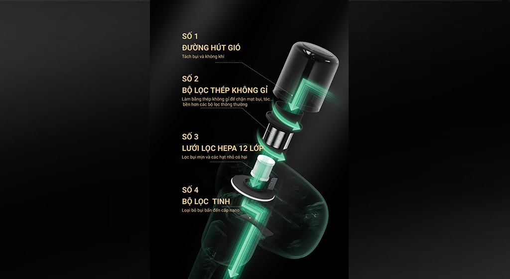 Sau khi toàn bộ bụi được hút vào bên trong thì cơ chế lọc bụi được kích hoạt, đầu tiên màng lọc Inox có tác dụng lọc bụi thô. Tiếp theo luồng khí sẽ được lọc ở tầng thứ 2 là màng lọc Hepa 12 lớp có tác dụng lọc sạch bụi mịn có kích thước lớn hơn từ 0,1-0,3 micron. Ở tầng lọc thứ 3 (cuối cùng) bụi sẽ được lọc sạch đến mức nano.