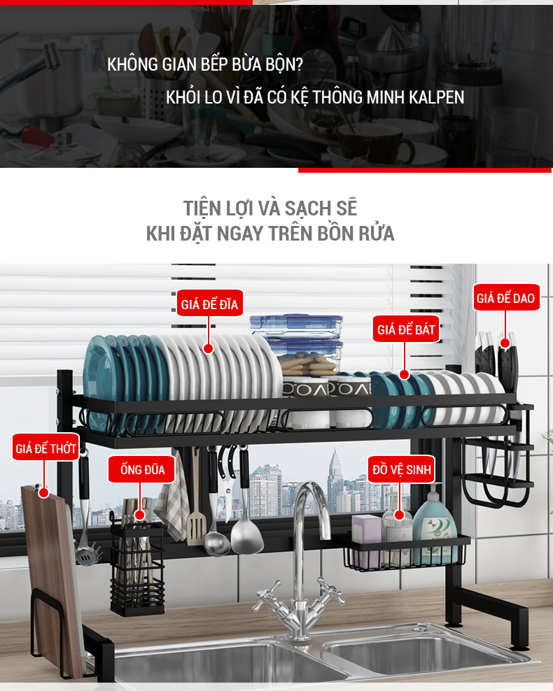 Hiểu được khó khăn này, thương hiệu đồ gia dụng thông minh Kalpen đã cho ra mắt dòng sản phẩm kệ để bồn đựng bát đũa thông minh với thiết kế kết hợp với bồn rửa nhà bếp. Đây có lẽ là 1 dạng thiết kế táo bạo nhất và đột phá nhất trên thị trường đồ gia dụng thông minh tại Việt Nam. Thay vì việc bạn vừa rửa bát trong bồn xong sau đó còn phải úp bát lên nơi chạn bát khá cao thì giờ đây, chiếc kệ bát gắn với bồn rửa đã được kết hợp với nhau cố định giúp các thao tác "rửa và úp bát" của bạn sẽ đỡ tốn sức hơn rất nhiều.
