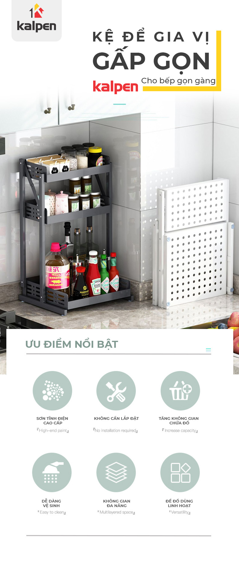 Kệ đựng gia vị thông minh là một trong những sản phẩm không thể thiếu trong căn bếp của bạn, là một trợ thủ đắc lực giúp cho công việc bếp núc của chị em trở nên thuận tiện hơn, trong đó kệ đựng gia vị gấp gọn 3 tầng nhà bếp thông minh Kalpen luôn là sản phẩm được ưa chuộng hiện nay, vậy lý do gì để sản phẩm này được yêu thích như thế, hãy cũng Kalpen tìm hiểu ngay nhé!