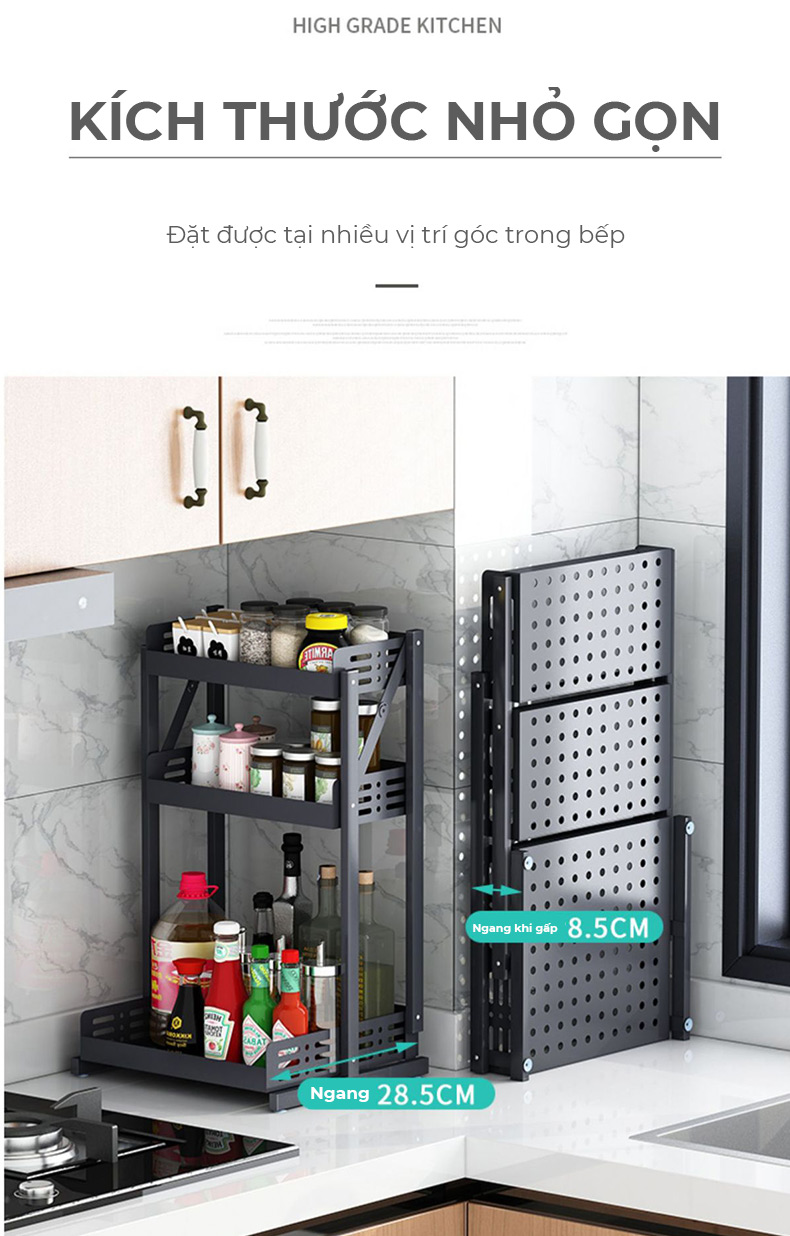 Kệ đựng đồ gia vị thông minh thường được ưa chuộng cũng bởi vì kích thước nhỏ gọn, của nó, kích thước cụ thể của kệ đựng đồ gia vị 3 tầng thông minh Kalpen là 28.5cm và bề ngang khi gấp chỉ là 8.5cm, với kích thước này, chiếc kệ có thể được đặt ở nhiều vị trí khác nhau trong góc bếp.