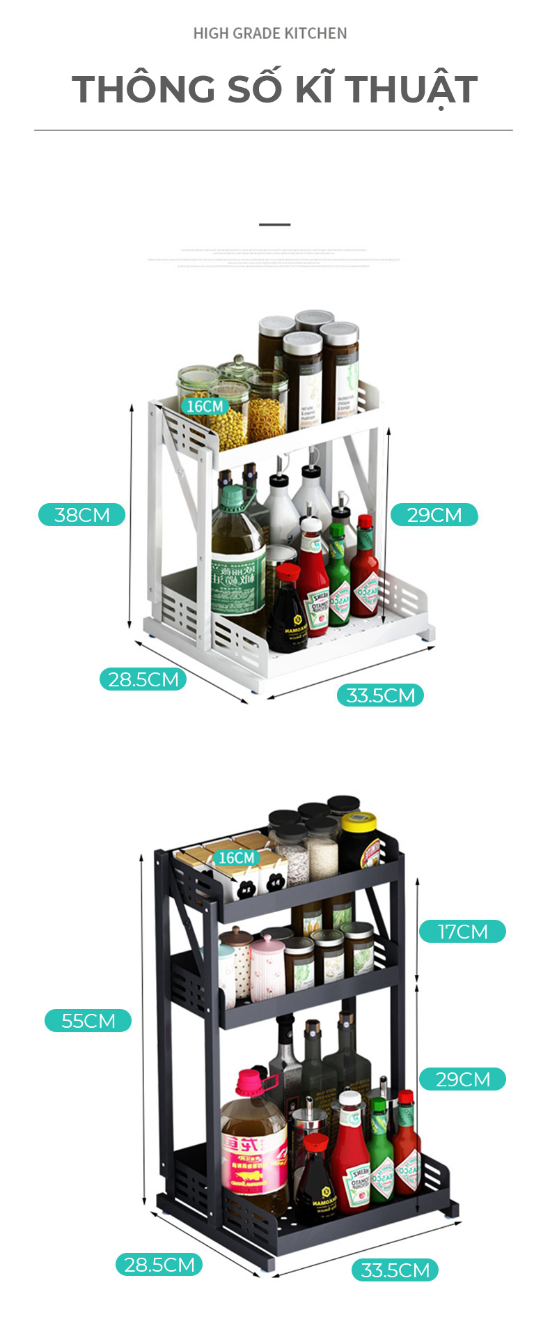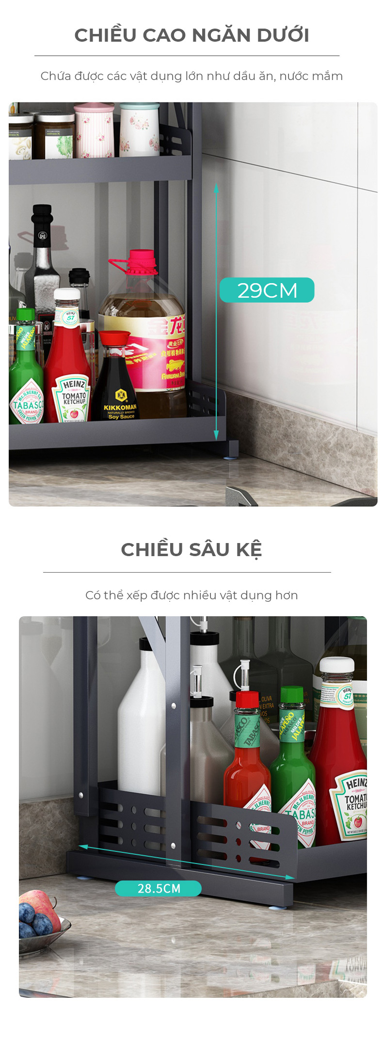 Kệ được thiết kế ba tầng với tầng thứ nhất có diện tích là 29x28.5cm, giúp chứa được các loại vật dụng lớn như dầu ăn, nước mắm,...Hai ngắn trên được thiết kế một cách chắc chắn với chiều rộng và chiều cao lần lượt là 16x17cm phù hợp với các loại gia vị nhỏ, như tiêu, muối, ớt,...Thông thường các kệ đựng gia vị thông minh sẽ được thiết kế chiều sâu lớn nhằm tác dụng có thể đựng được nhiều đồ dùng hơn.