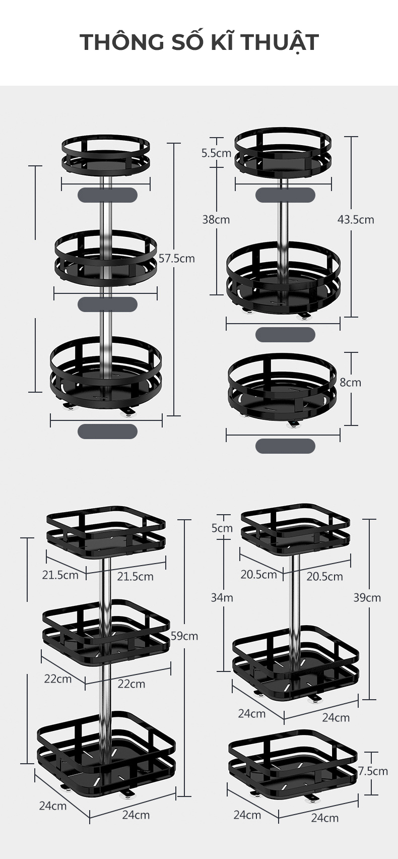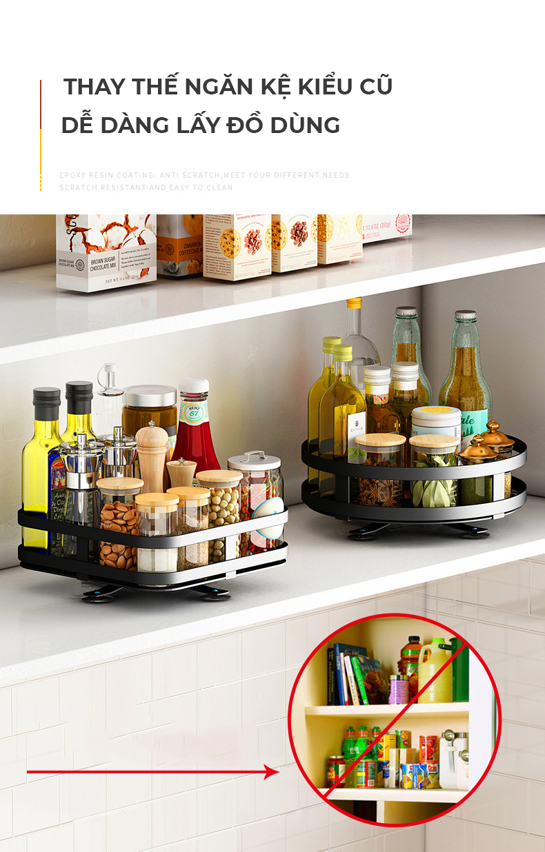 Rõ ràng đây chính là một trong những tác dụng lớn nhất của các loại kệ đựng đồ nói chung và kệ đựng gia vị xoay 360 độ thông minh nói riêng. Thông thường các loại kệ đựng gia vị sẽ được tính toán, đo lường một cách cẩn thận để được sản xuất ra theo nhiều kích thước khác nhau để phug hợp với nhiều không gian cũng như phong cách nhà bếp riêng của từng gia đình.