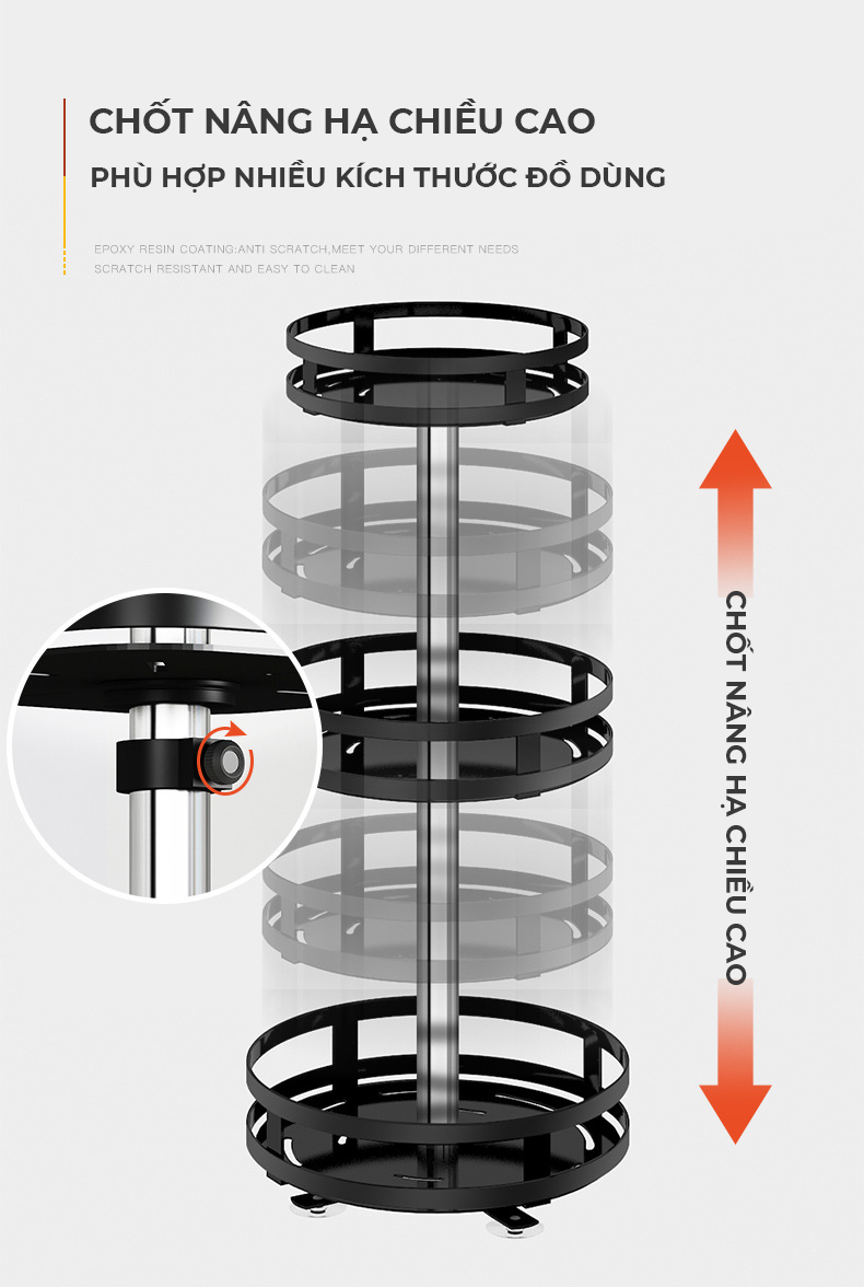 Với thiết kế các tầng thông minh, bạn có thể sắp xếp được tầng nào, khu vực nào đựng các loại gia vị nào. Với các loại kệ có chiều cao lớn và diện tích rộng bạn có thể để các loại chai lọ lớn như dầu ăn, nước mắm,... với các tầng kệ có diện tích và chiều cao bé hơn bạn có thể để các loại gia vị thông dụng như mắm, muối, tiêu, đường,... từ đó, các loại gia vị sẽ được sắp xếp một cách rõ ràng, tránh lẫn lộn và việc nấu ăn sẽ được trở nên dễ dàng, thuận tiện hơn.