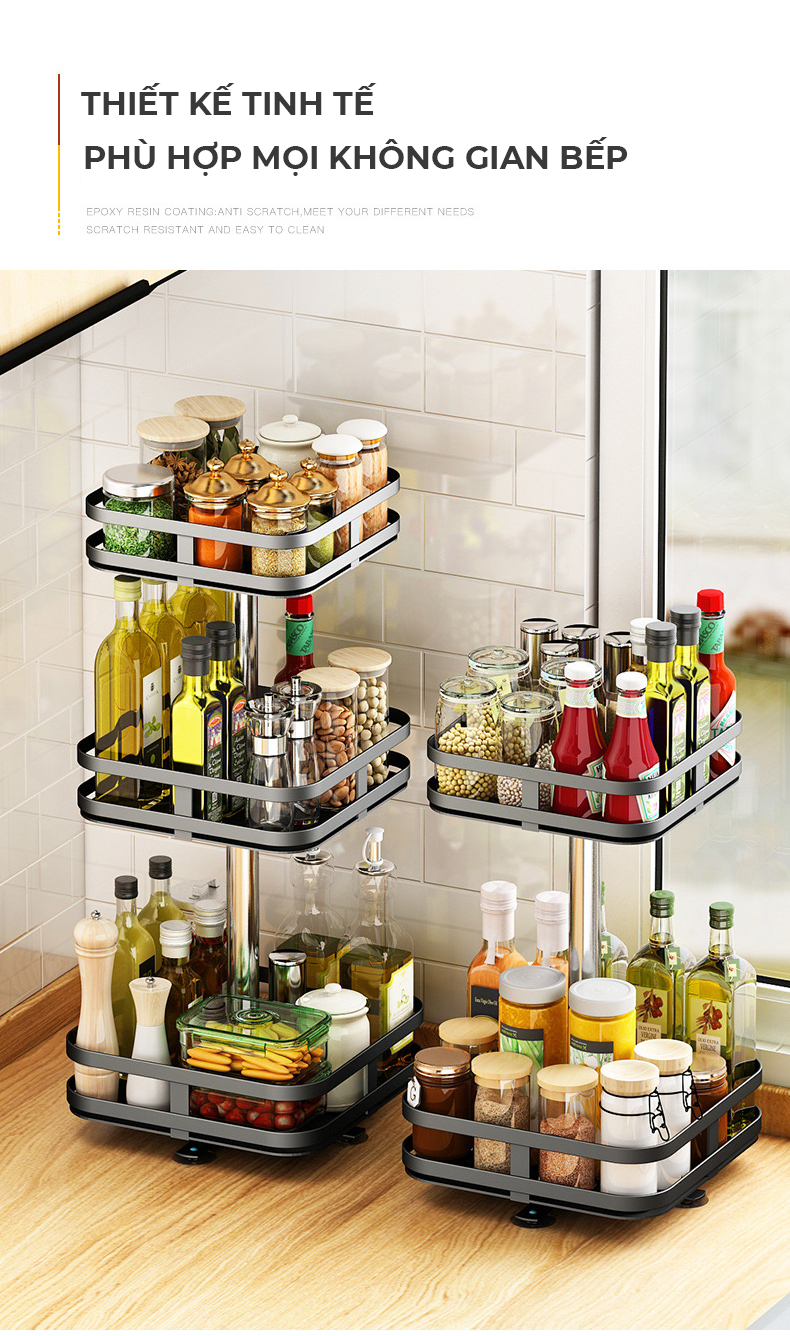 Các mẫu mã, kiểu dáng của kệ đựng gia vị được thiết kế đa dạng để phù hợp với mọi nhu cầu, phong cách thiết kế nội thất cũng như sở thích cá nhân của các chủ nhà, vì thể, việc sở hữu một kệ đựng gia vị xoay 360 độ thông minh, căn bếp của bạn sẽ có được điểm nhấn nổi bật, tôn lên sự sang trọng, tinh tế cho căn nhà.