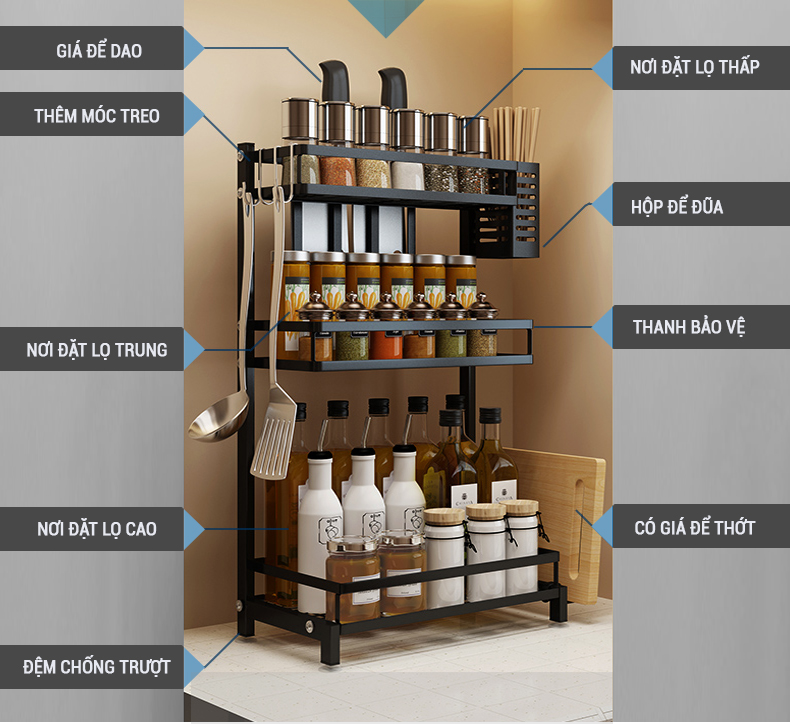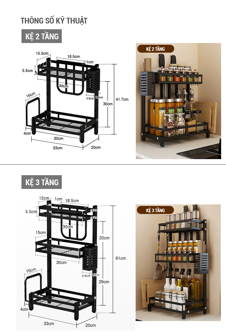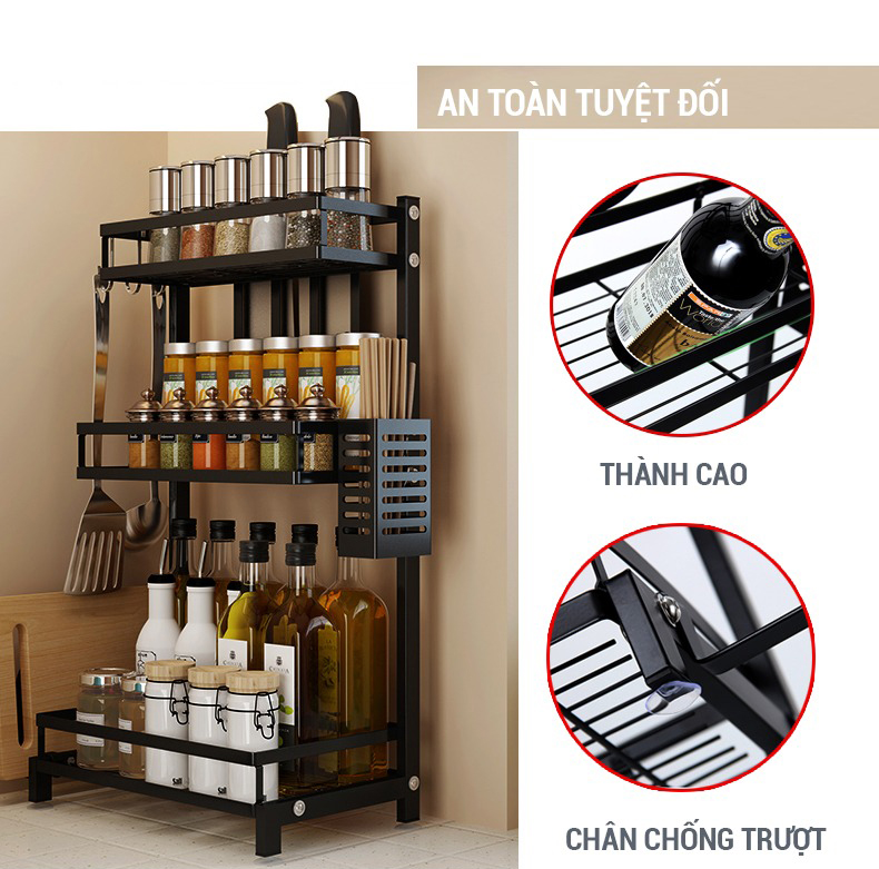 Các loại kệ gia vị hiện nay có kích thước vô cùng đa dạng, bạn sẽ có thể lựa chọn kệ 2 tầng, 3 tầng,… tùy theo ý muốn của bạn và không gian căn bếp của bạn. Với khung kệ gia vị đa năng có thể chứa những lọ gia vị có dung tích lớn. Bên cạnh đó, kệ gia vị còn giúp người dùng phân loại và sắp xếp gia vị một cách hợp lí hơn tránh nhầm lẫn khi sử dụng.