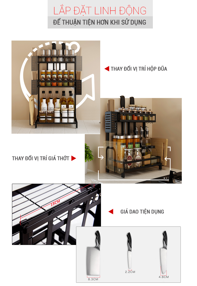 Kệ để gia vị đa năng rất tiện lợi, với kích thước như vậy chân đế có thể hỗ trợ bạn tiết kiệm tối đa diện tích căn phòng của bạn.
